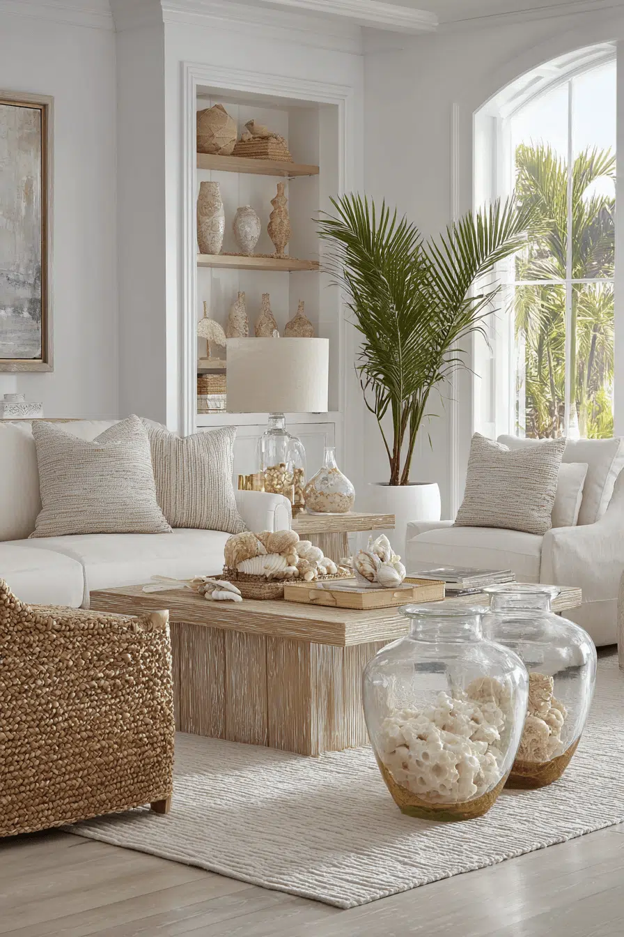 Shell and glass accents add delicate shimmer to beach house decor. Clear vases and subtle shell details catch natural light beautifully. Keep arrangements curated and minimal. Neutral backgrounds enhance their sparkle. This approach maintains balance while adding elegance. Click to sprinkle refined coastal beauty throughout your home.
