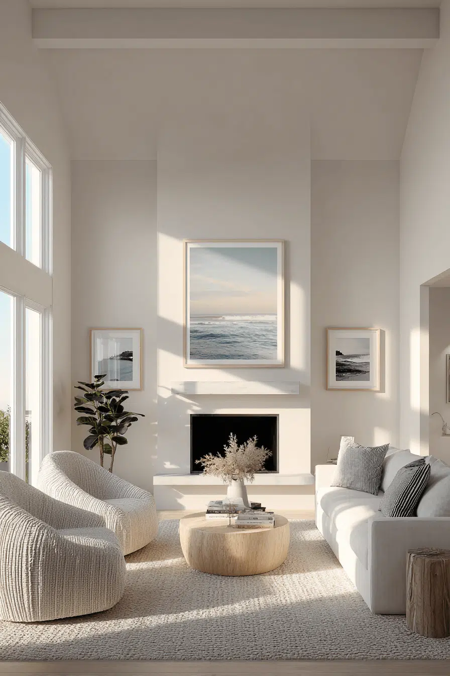 Chalky white walls create a luminous backdrop for beautiful beach house decor. The soft finish reflects sunlight while adding subtle texture. This works perfectly because beach house decor thrives on brightness and openness. Layer in neutral furnishings and organic elements to maintain warmth. Add subtle blue details for depth. Click to transform your space with light-enhancing walls.