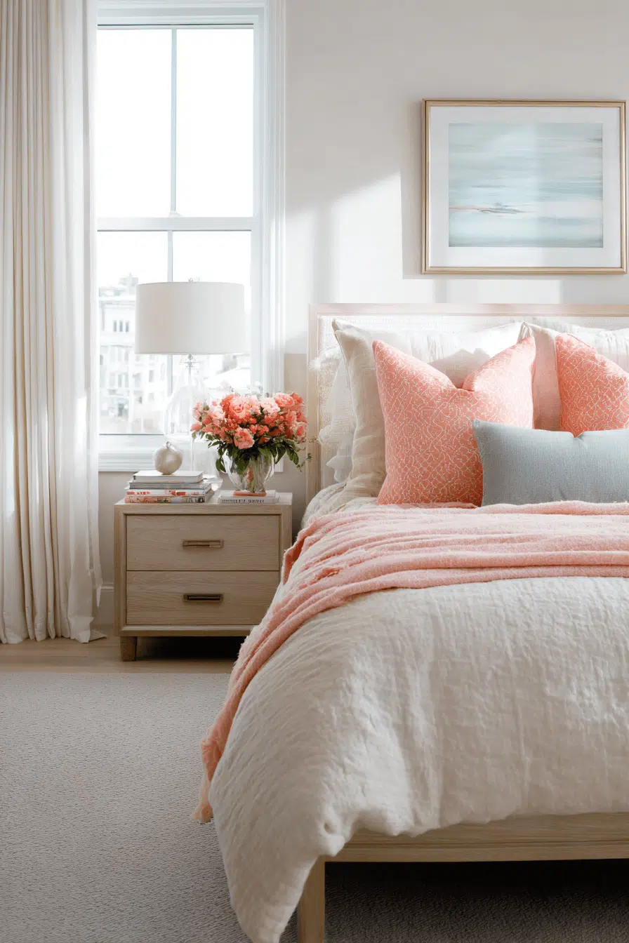 Soft coral accents introduce gentle warmth into beach house decor. The muted pink hue pairs gracefully with sand and sea tones. Used thoughtfully, it adds contrast without overwhelming. Incorporate coral through pillows or art for impact. Keep the base palette calm. Tap to warm up your beach house decor with coastal color.