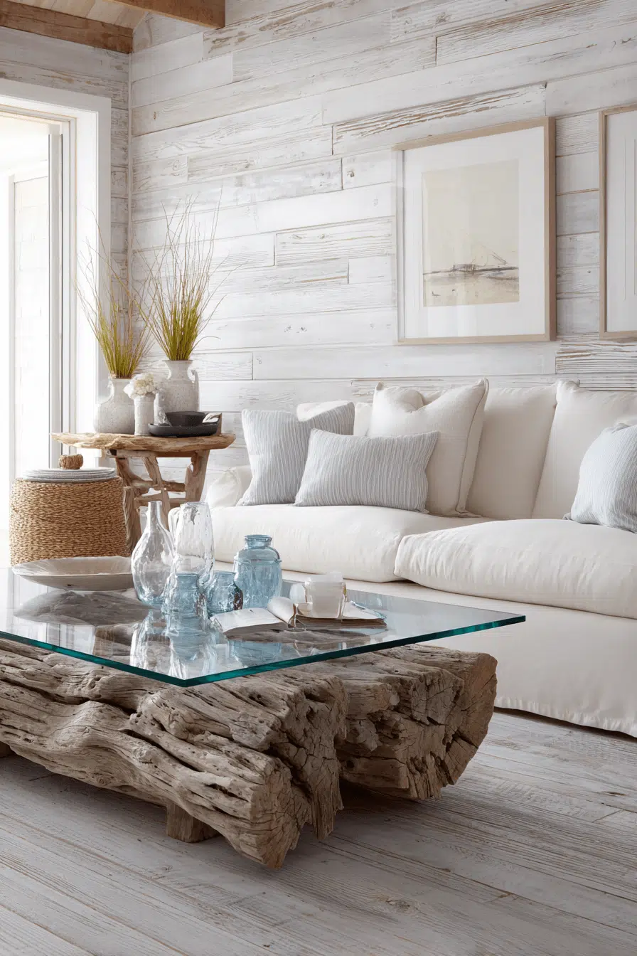 Weathered wood accents add character and authenticity to beach house decor. A reclaimed table or sun-faded frames introduce organic texture that feels grounded and natural. The worn finish contrasts beautifully with bright walls and flowing textiles. This works because beach house decor celebrates materials shaped by sea air and time. Keep styling minimal so the texture shines. Click to layer rustic warmth into your coastal space.