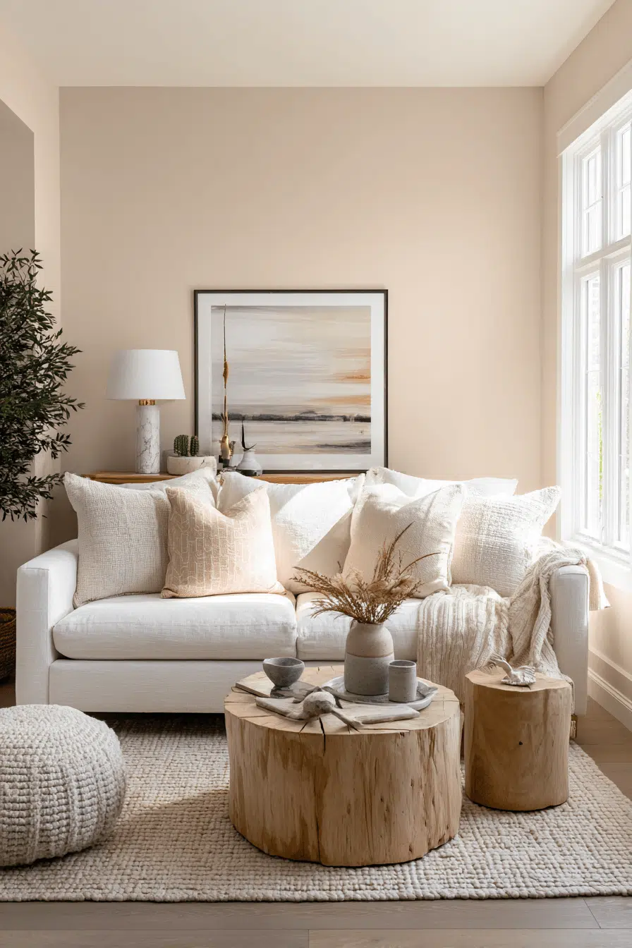 Warm sand-inspired tones wrap beach house decor in subtle comfort. Creamy beige, muted blush, and pale gray blend seamlessly for a natural glow. These hues echo shoreline colors, creating harmony throughout the room. Pair with woven rugs and oak furniture for depth. Crisp trim keeps everything feeling fresh and defined. Tap to introduce this soothing palette into your home.