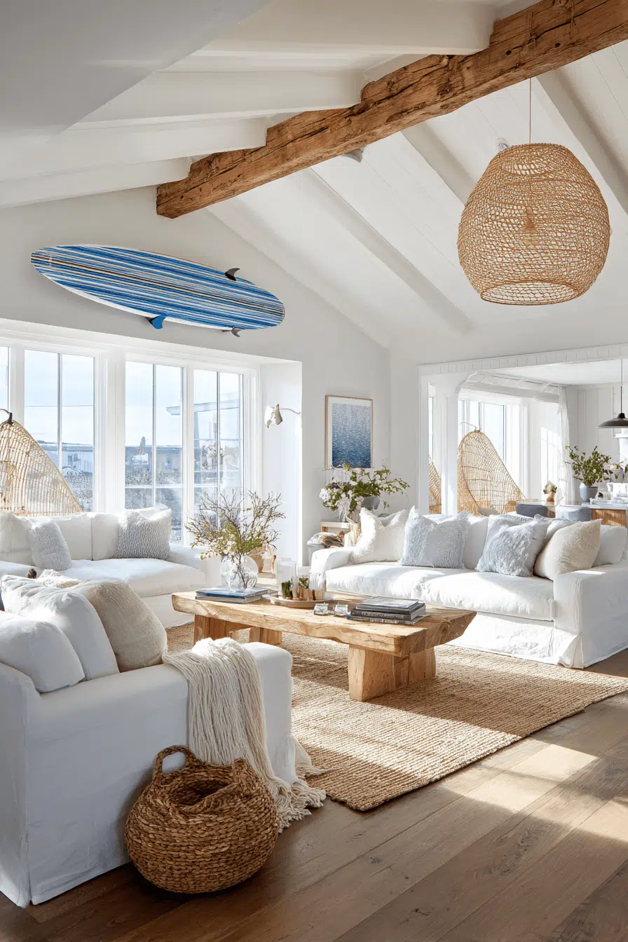 A bright surf retreat captures the easygoing spirit of beach house decor. Oversized sofas, sunlit spaces, and natural fibers create an inviting lounge vibe. Surfboards displayed as décor add personality without clutter. This works because beach house decor often reflects lifestyle as much as location. Keep the layout open for gathering and relaxation. Click to design your own laid-back surf sanctuary.