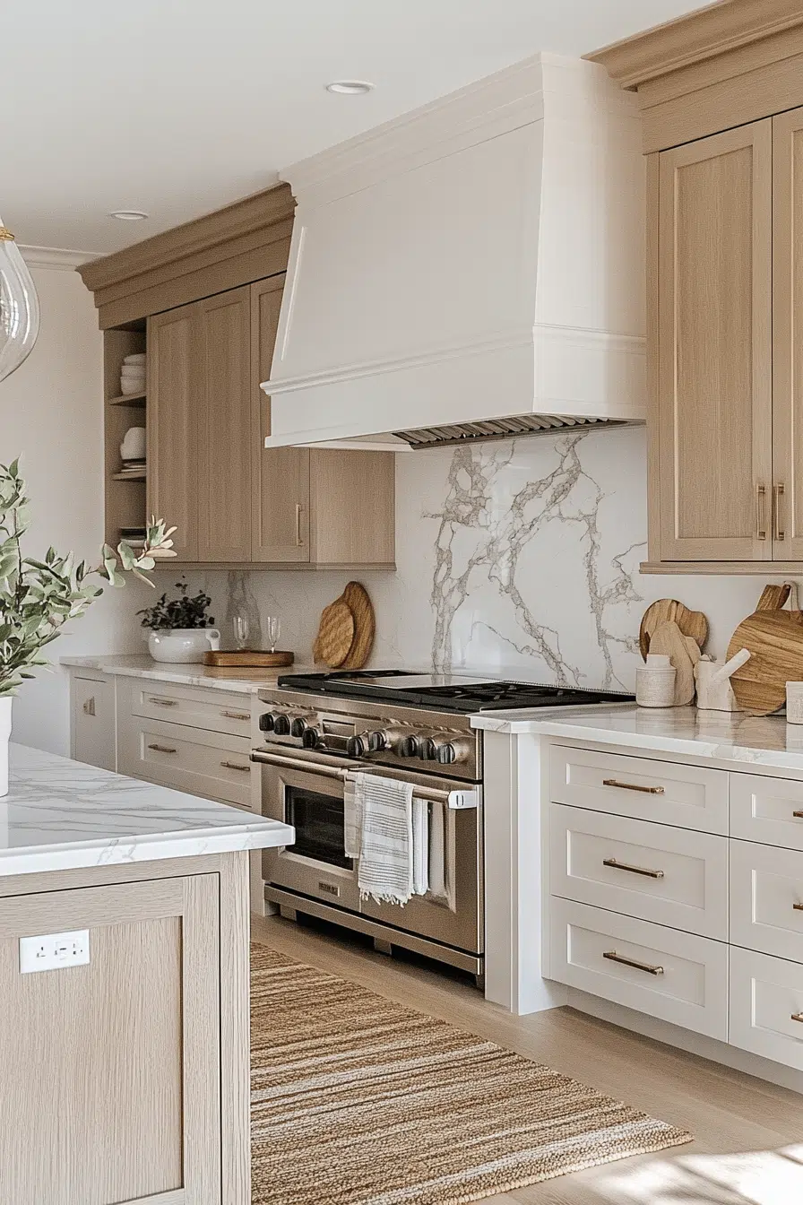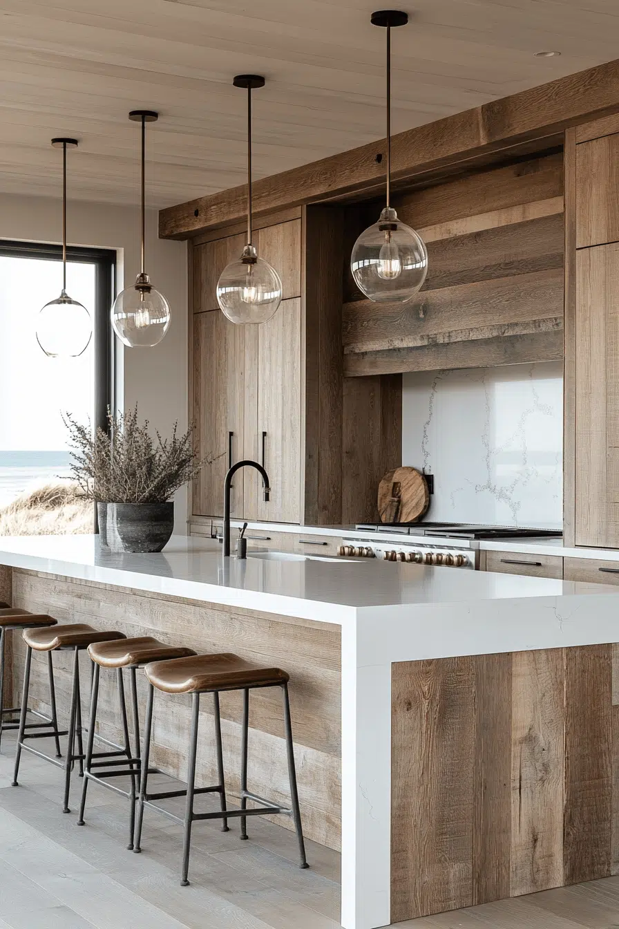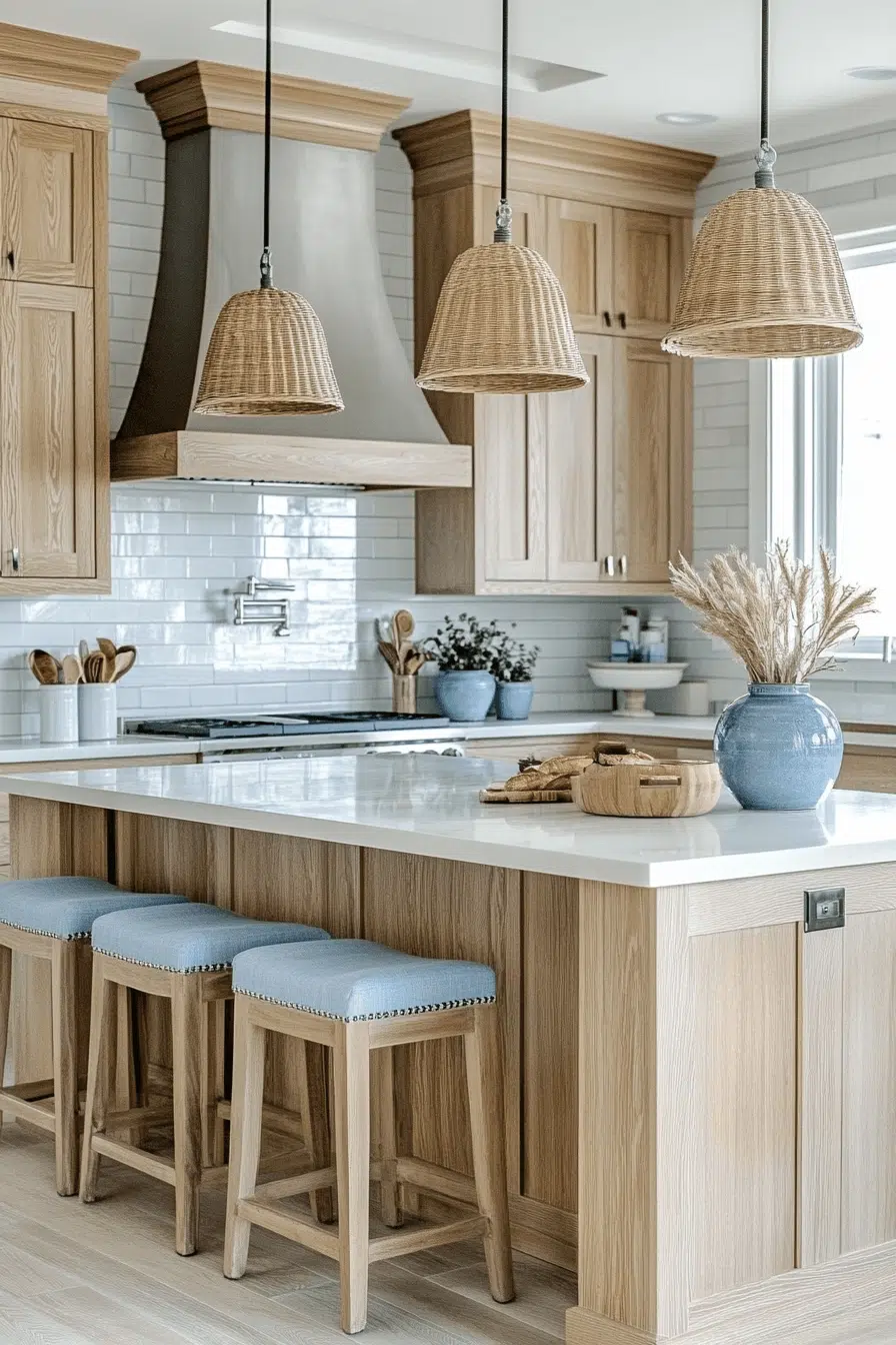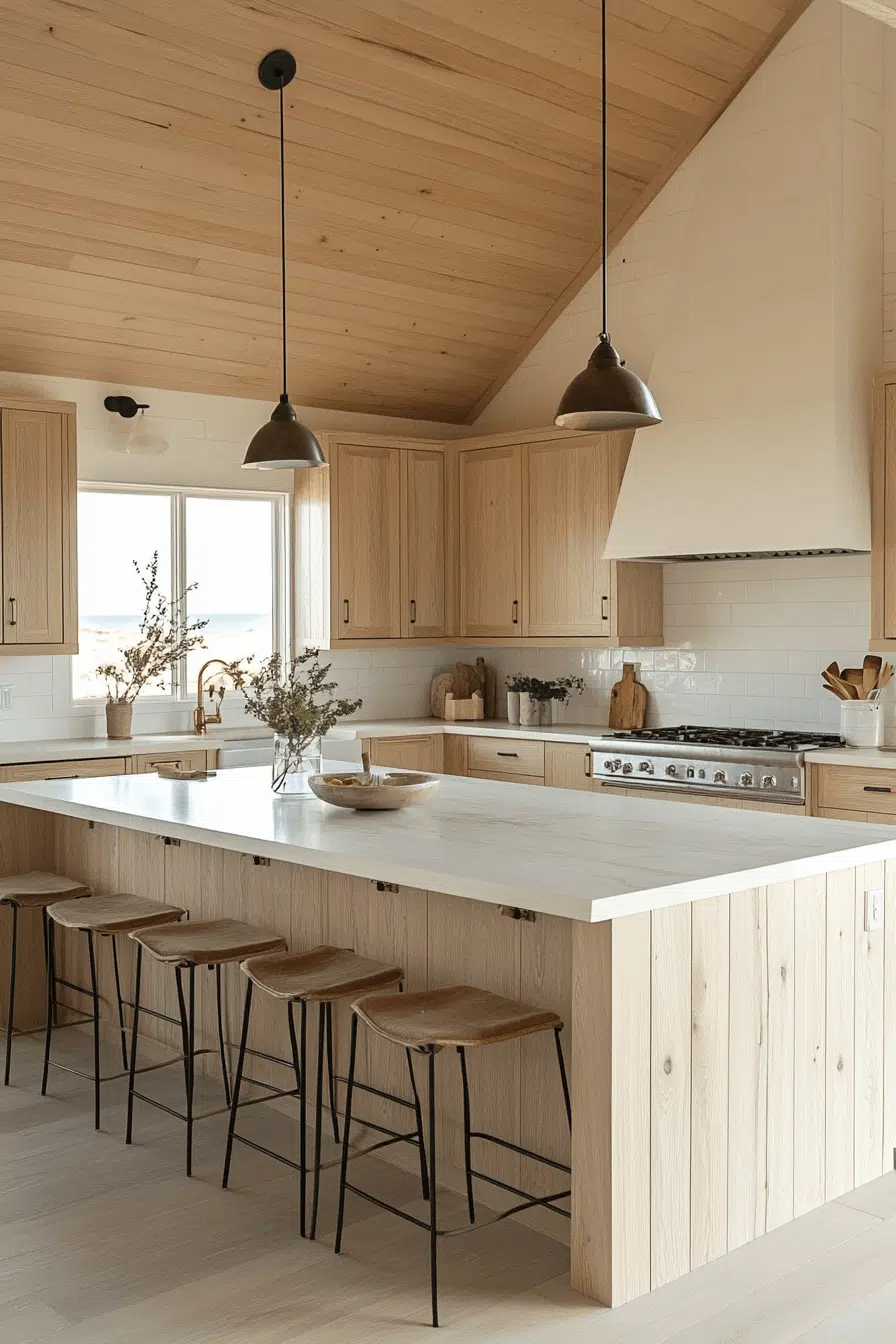 Organic wood textures layered with crisp surfaces give a beach house kitchen depth without heaviness. Warm oak cabinetry pairs seamlessly with white quartz countertops for a balanced look. Minimal hardware keeps the styling sleek and modern. The wood grain echoes driftwood along the shore. It feels grounded yet airy at the same time. Tap to explore this warm coastal kitchen concept.
