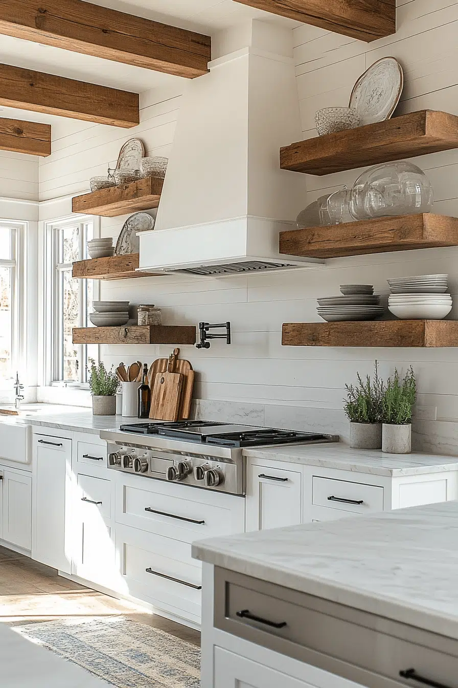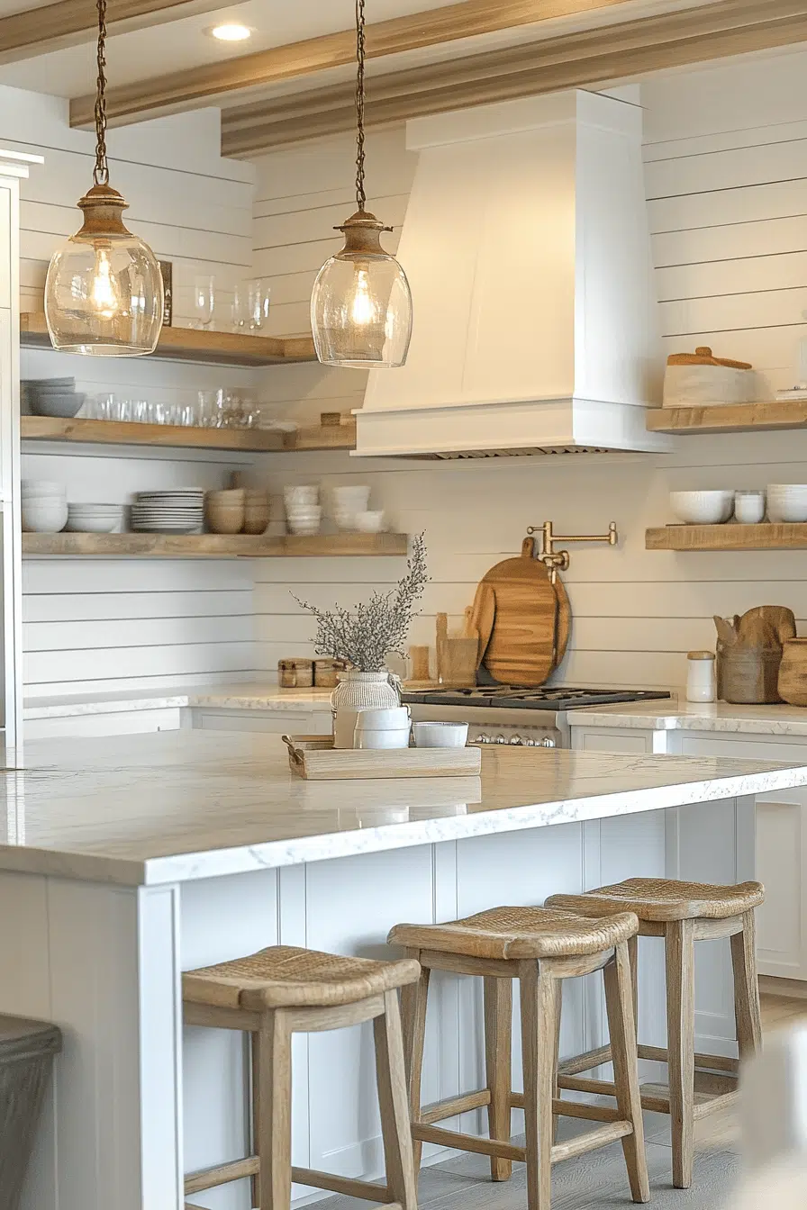 Shiplap walls and open shelving introduce farmhouse warmth into a relaxed beach house kitchen. The light palette keeps everything breathable and bright. Modern fixtures balance traditional textures beautifully. The layered design feels inviting without clutter. It’s cozy seaside charm done right. Click to blend farmhouse warmth with coastal freshness.