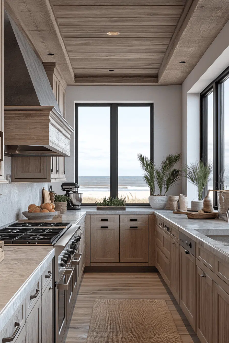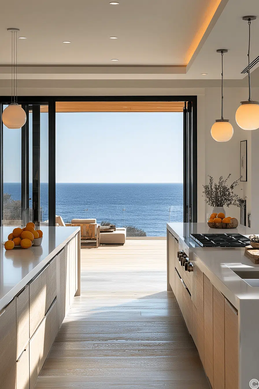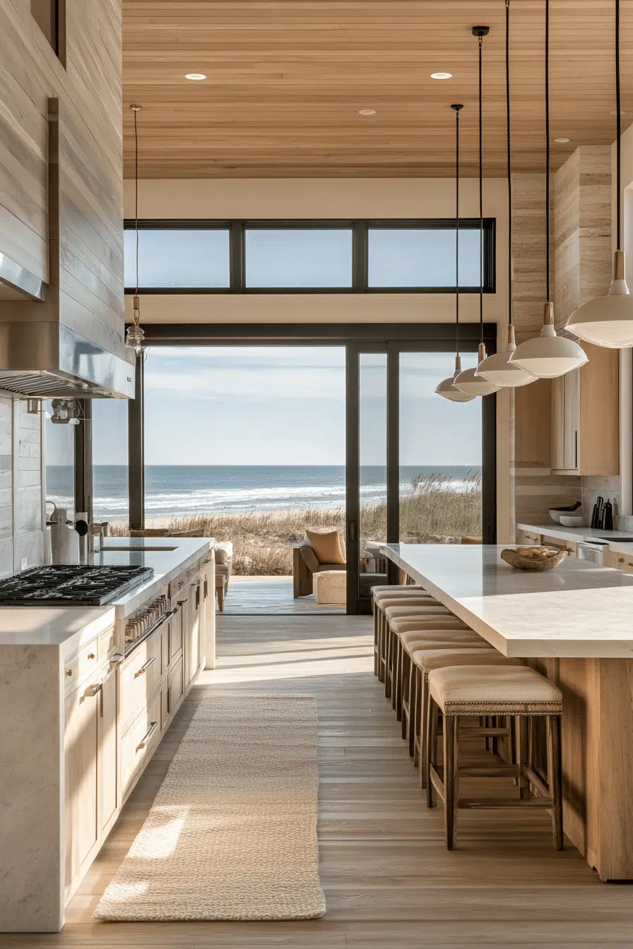A panoramic open layout enhances a modern beach house kitchen by maximizing light and flow. Oversized islands create space for gathering and entertaining. Reflective finishes bounce sunlight across every surface. The openness encourages movement and connection. It’s expansive, welcoming, and beautifully coastal. Click to design your kitchen around openness and view.