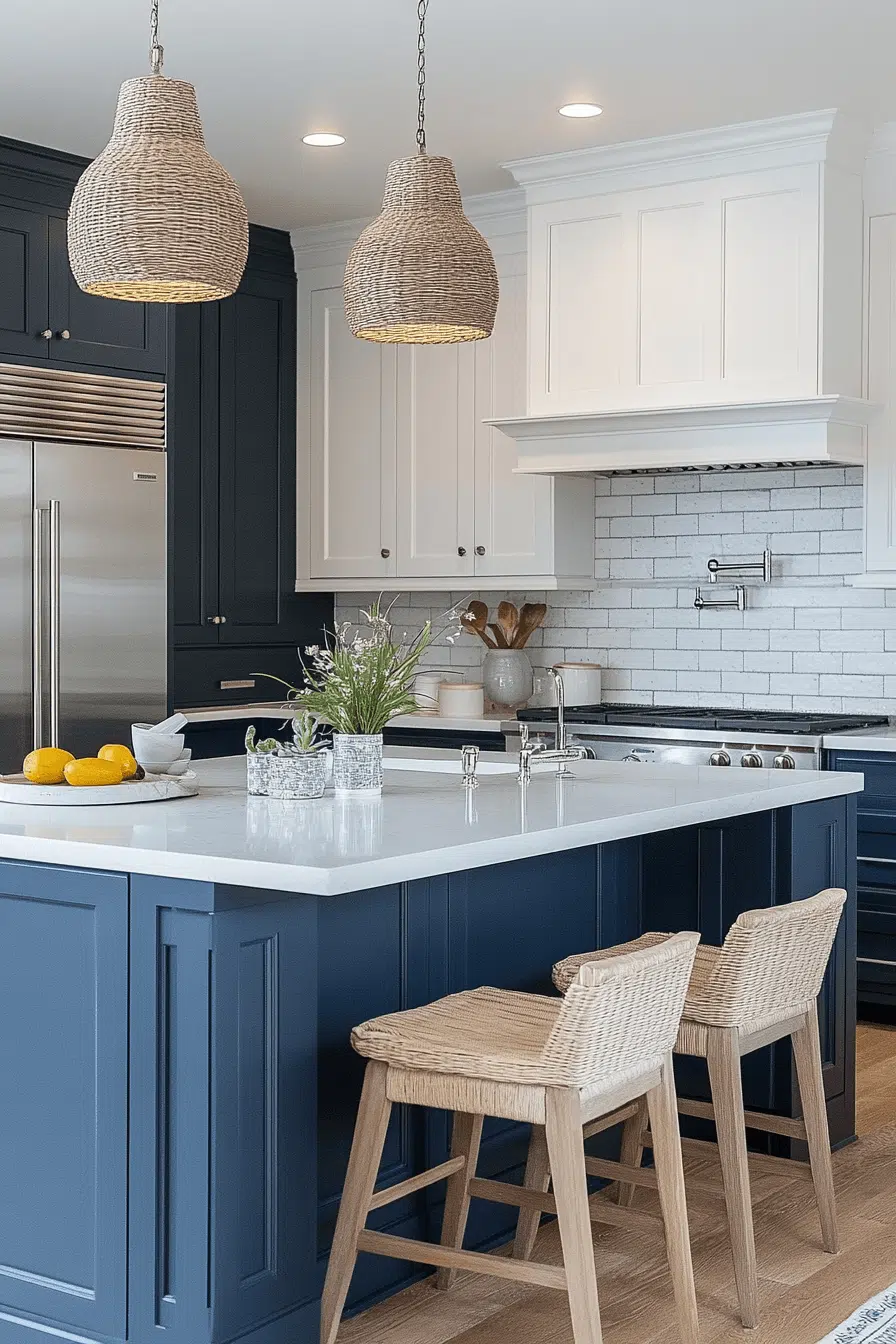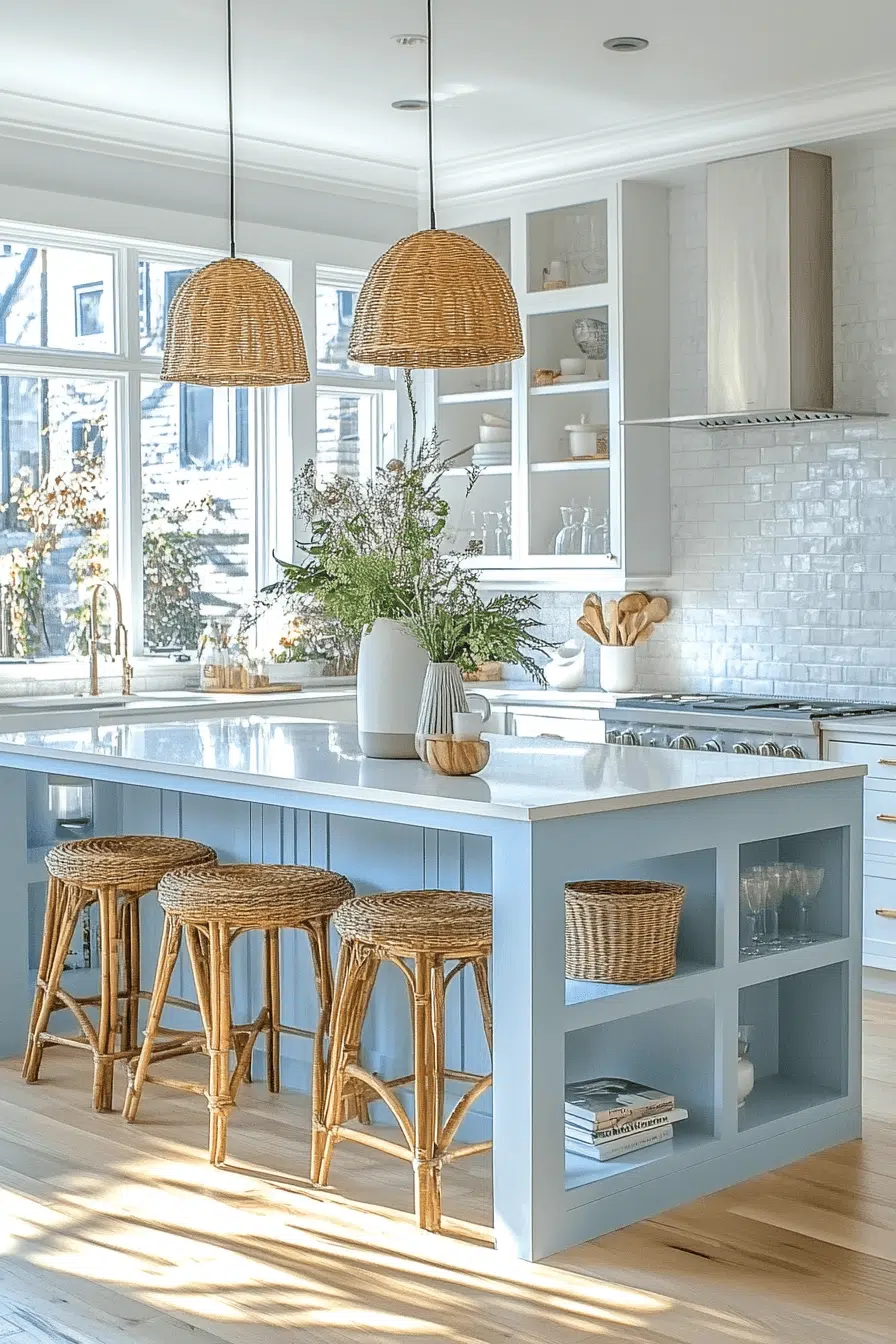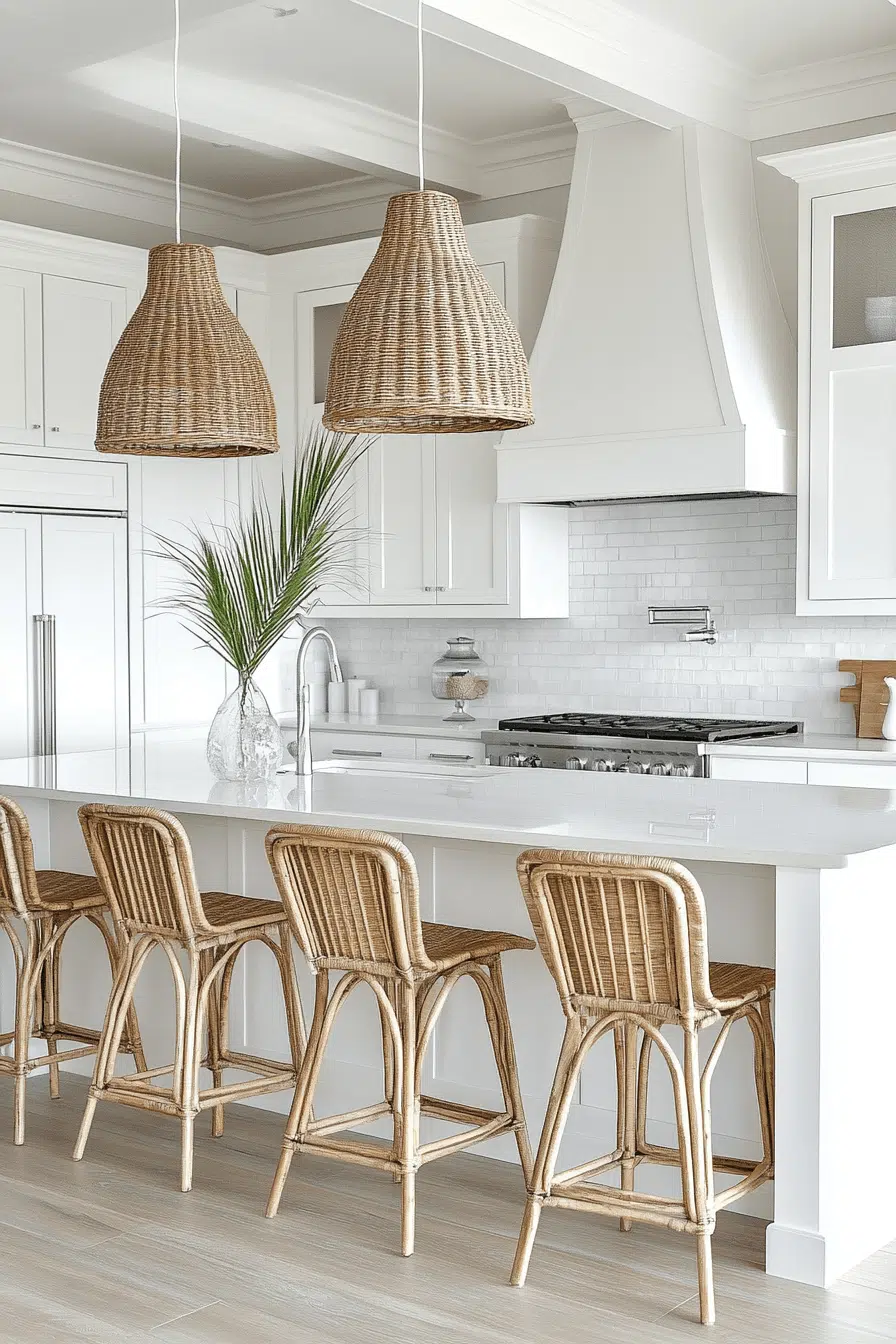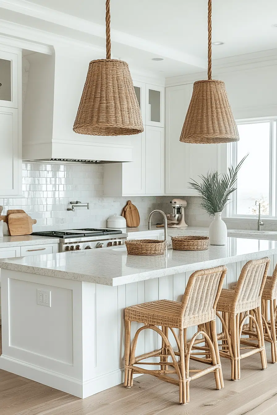 Rattan seating and woven pendant lights add warmth and depth to a stylish beach house kitchen. White cabinetry provides a crisp backdrop for texture. The organic materials connect the space to seaside living. The layered look feels casual yet curated. It’s natural texture done beautifully. Tap to incorporate woven details into your kitchen.