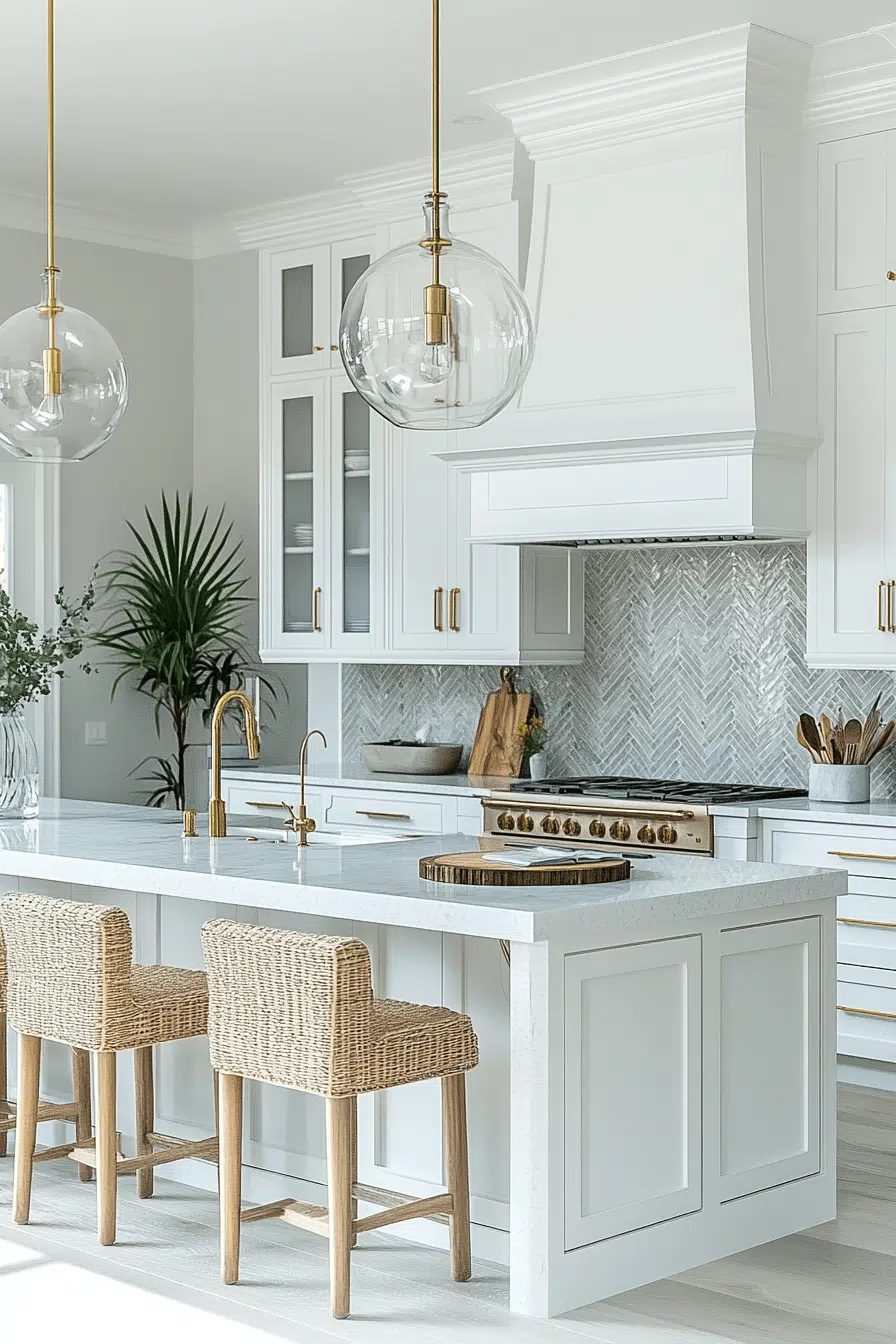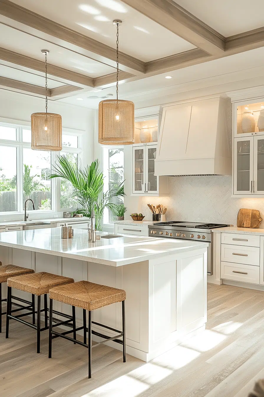 Crisp white cabinetry accented by natural rattan creates airy charm in a timeless beach house kitchen. The woven details add dimension without visual heaviness. Light countertops keep the look cohesive. The palette feels fresh and inviting. It’s coastal simplicity perfected. Tap to brighten your space with this classic pairing.