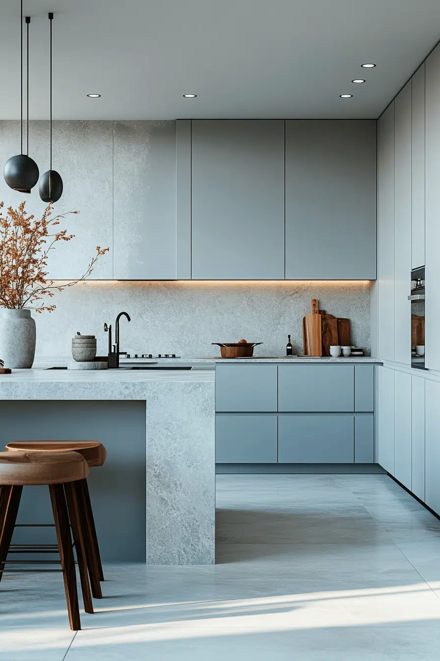 Pale gray-blue tones introduce subtle mood into a minimalist beach house kitchen. The gentle hue reflects misty mornings by the water. Flat-front cabinets enhance the modern aesthetic. The space feels calm and polished. It’s understated coastal beauty. Click to refresh your kitchen with this soft hue.