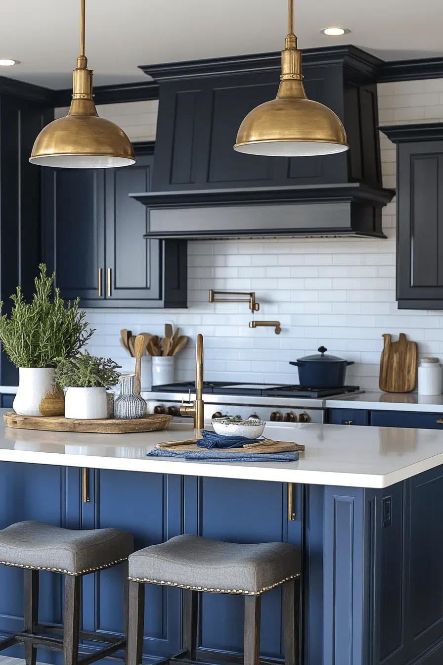 Bold navy accents paired with warm brass elevate a dramatic beach house kitchen. The dark tone contrasts beautifully against lighter surroundings. Clean silhouettes keep the design balanced. The overall look feels confident and modern. It’s statement coastal style at its best. Click to explore this bold seaside contrast.