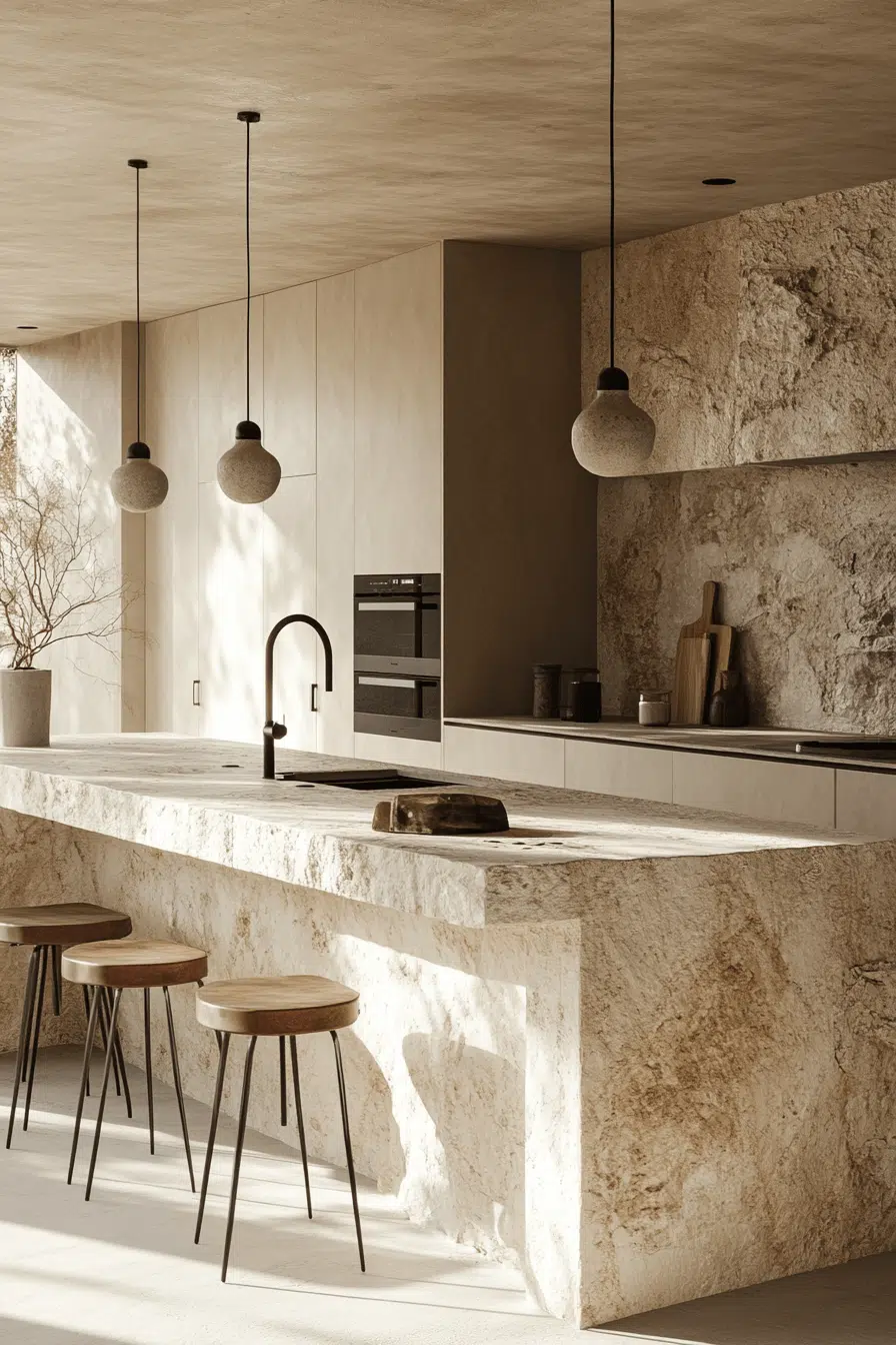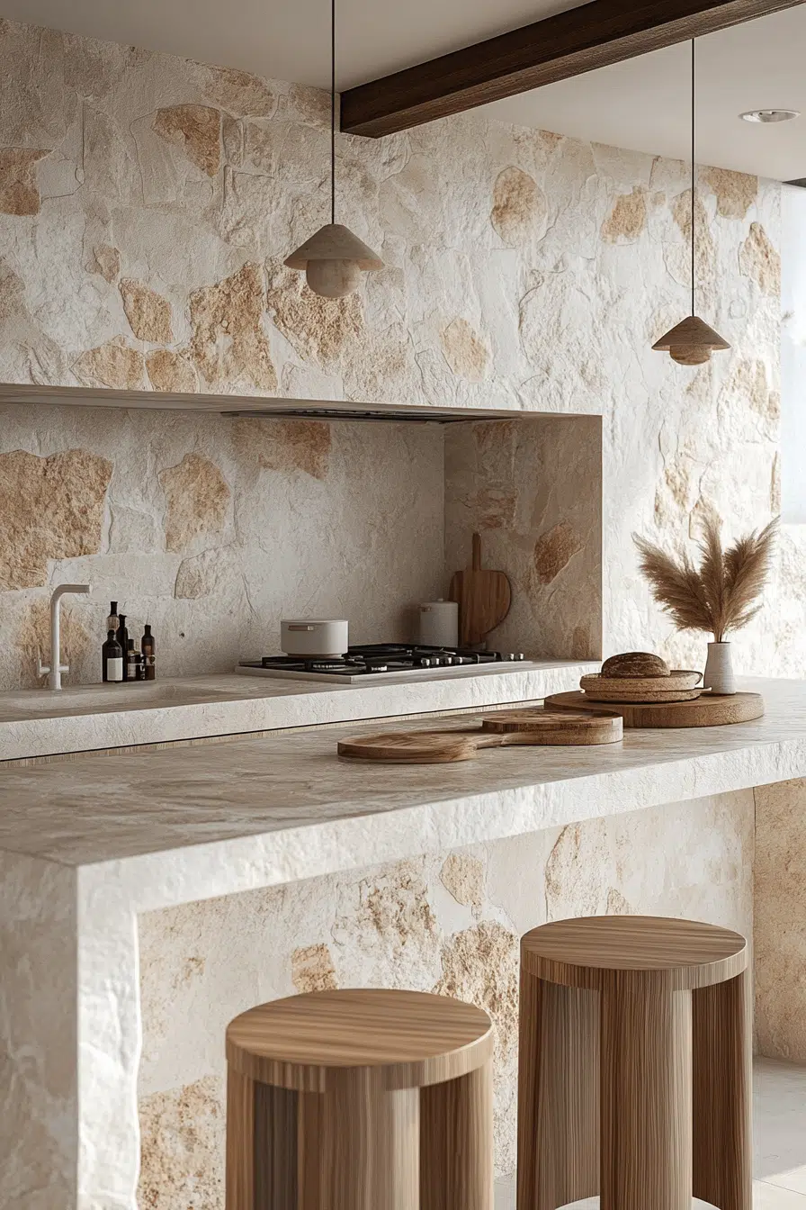 Textured stone backsplashes introduce depth and authenticity into an elevated beach house kitchen. The natural material adds organic character. Light cabinetry ensures balance. The blend of raw texture and polished finishes feels refined. It’s coastal craftsmanship beautifully executed. Tap to add stone detail to your kitchen.