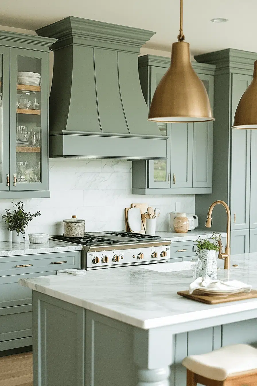 A misty sea-inspired green brings personality into a sophisticated beach house kitchen. The muted shade feels refined rather than bold. Paired with marble surfaces and brushed brass details, the space instantly feels elevated. The color reflects coastal waters in a subtle way. It’s playful yet polished. Click to explore this sea-inspired palette.