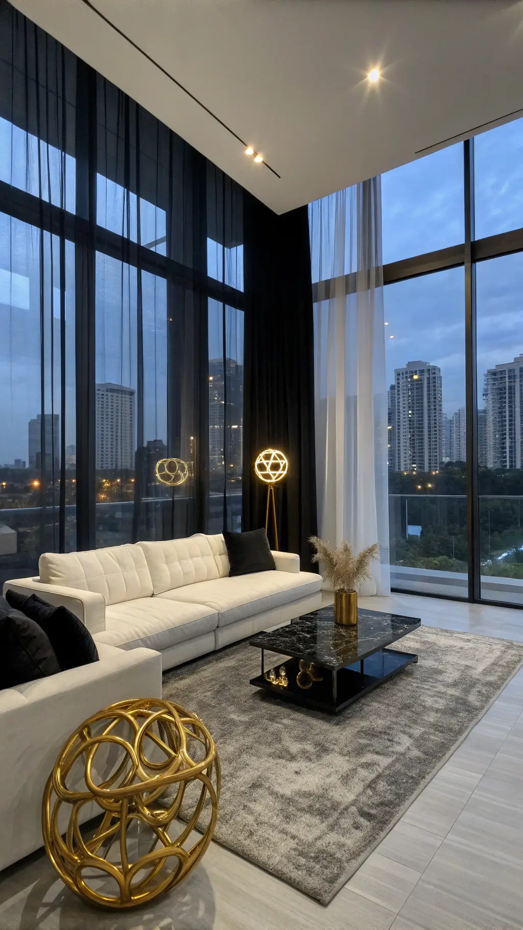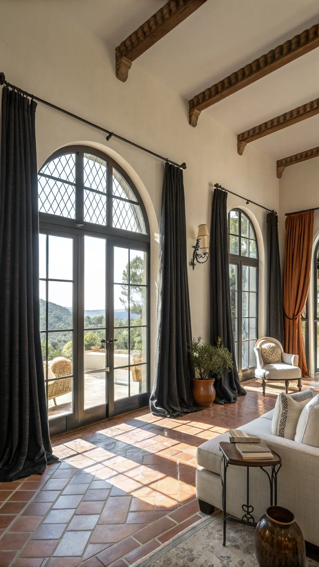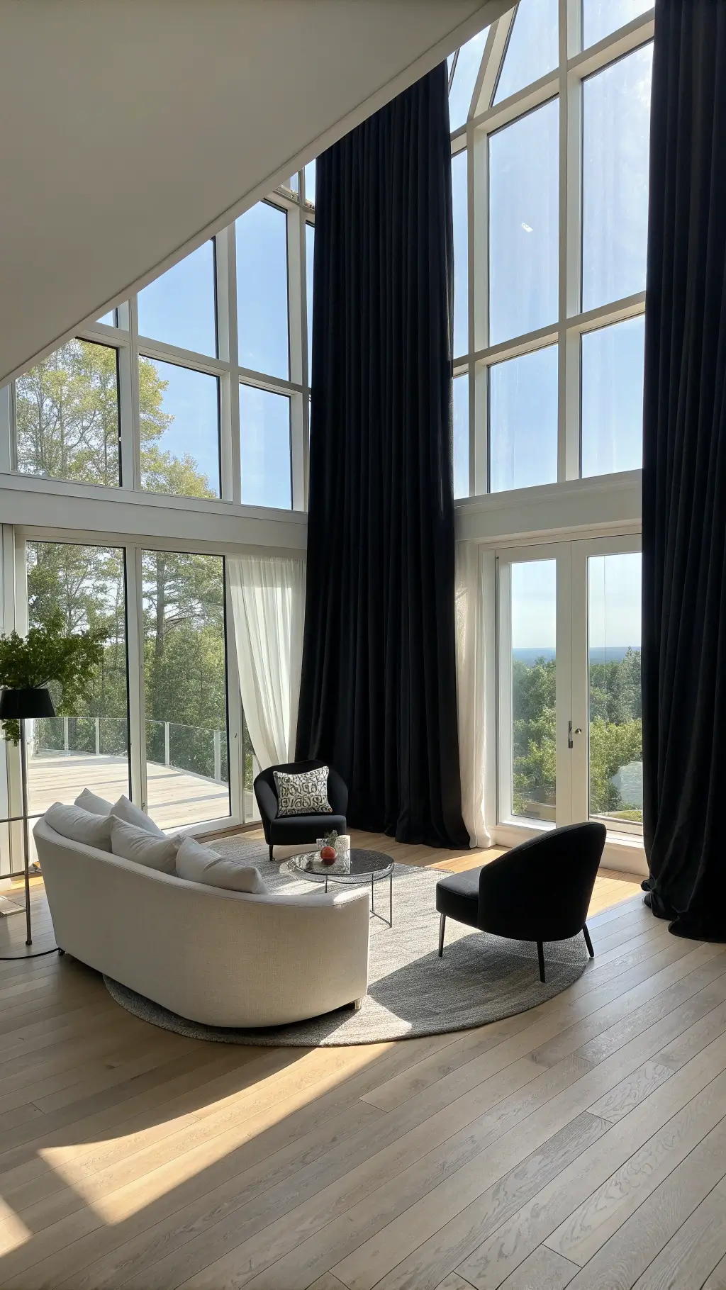 - Warm Contrast: Black curtains + warm wood tones + cream accessories
