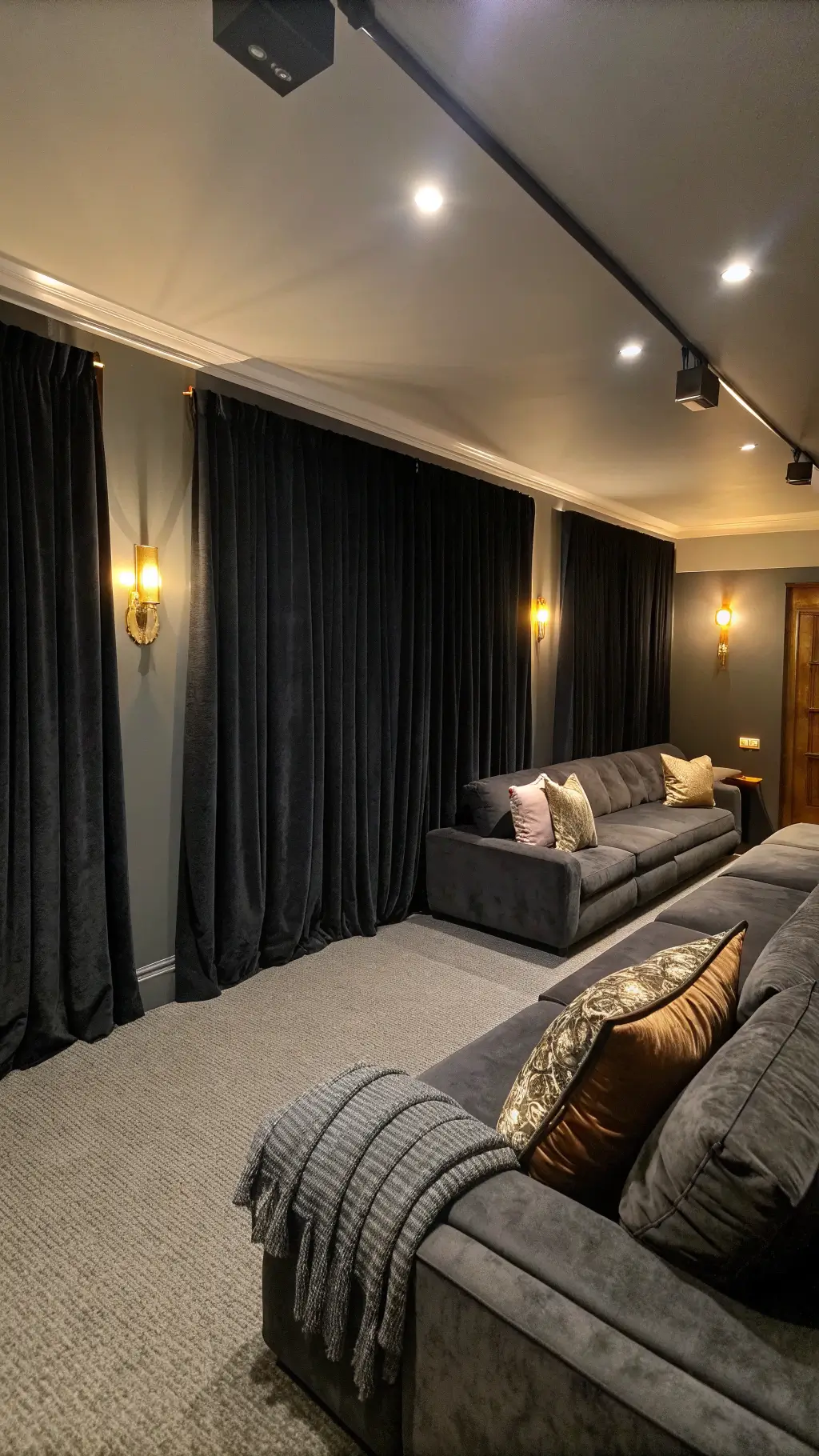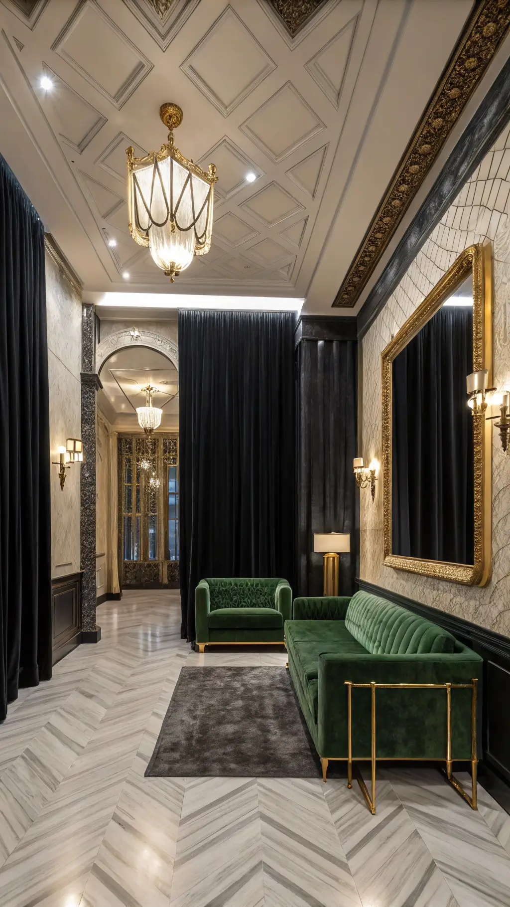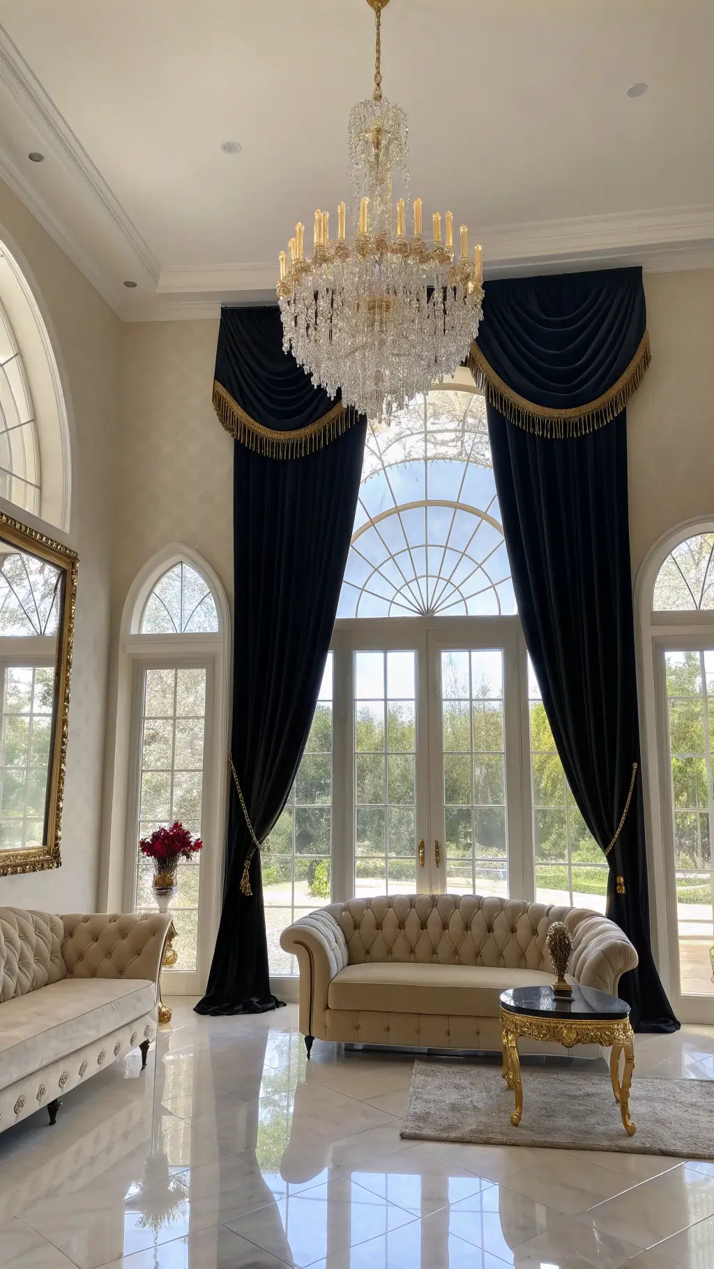 - Dramatic Glam: Black velvet curtains + gold side tables + statement artwork