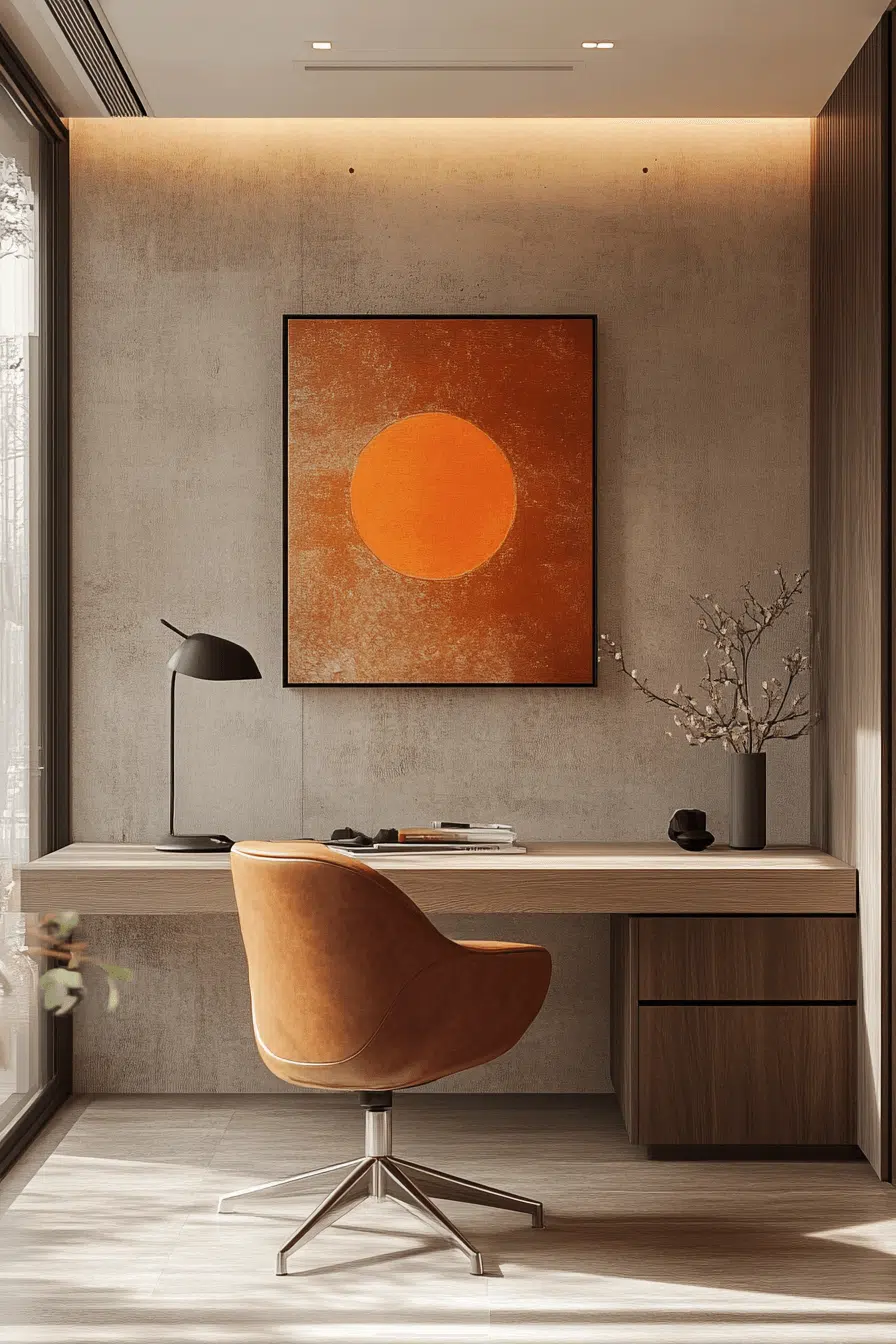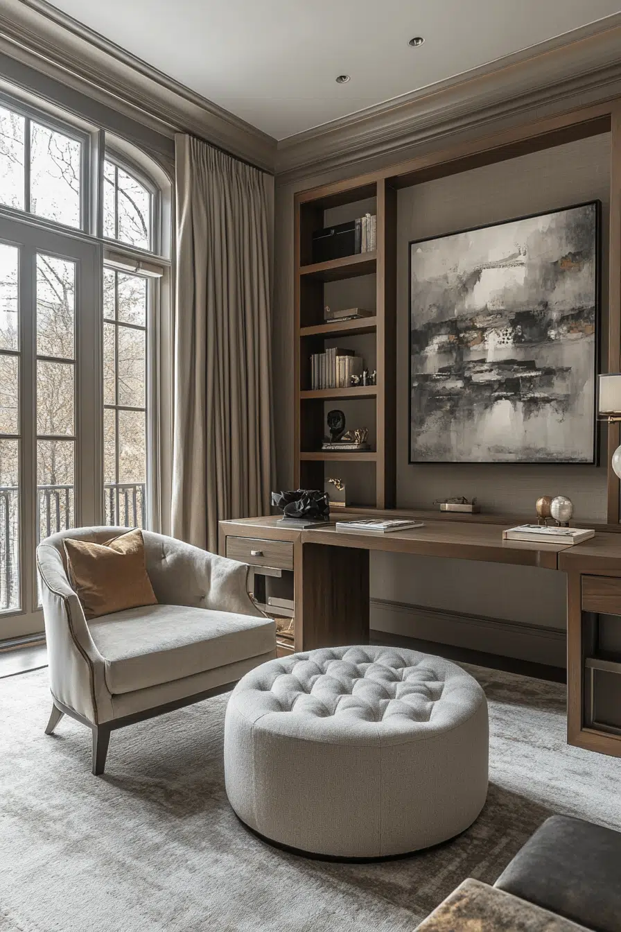 Warm mushroom tones layered with soft upholstery create understated elegance. Texture adds richness without overwhelming the eye. This refined style supports calming office decor by keeping the palette cohesive and gentle. Keep décor purposeful and minimal. The space feels nurturing and sophisticated. Anchor your office with warmth and texture today.
