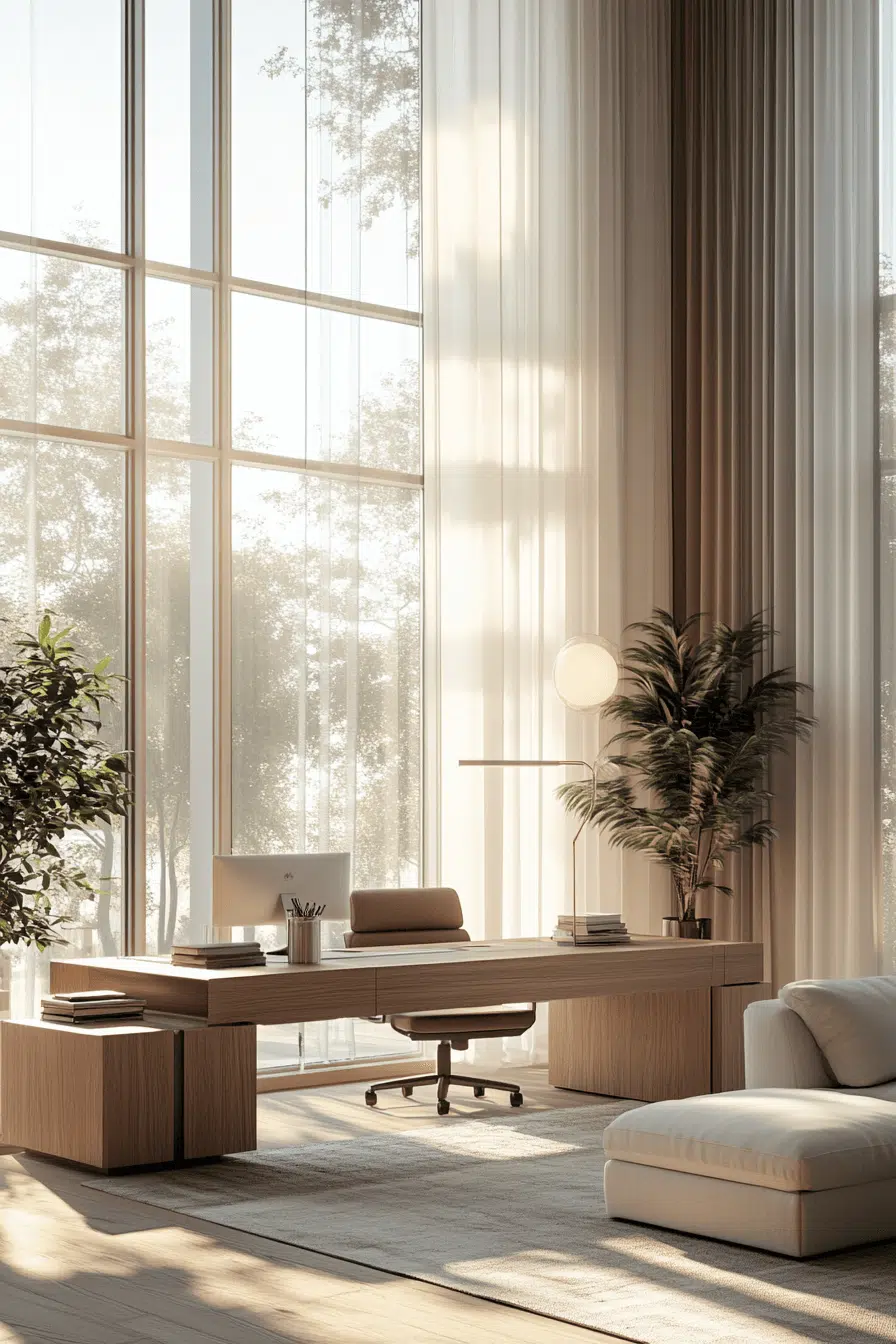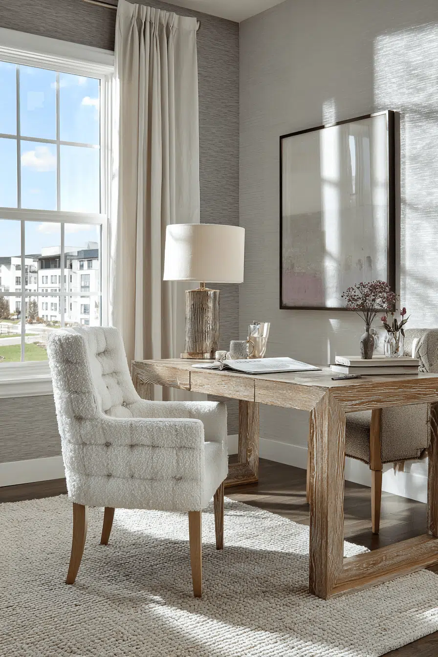 Natural linen paired with honey-toned oak creates effortless sophistication. Breathable fabrics balance the strength of wood finishes. This pairing enhances calming office decor by blending texture and warmth. Keep styling restrained for visual ease. The atmosphere feels welcoming and grounded. Redefine your workspace with organic elegance today.