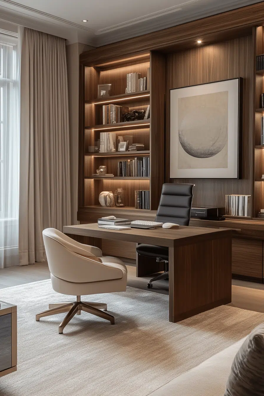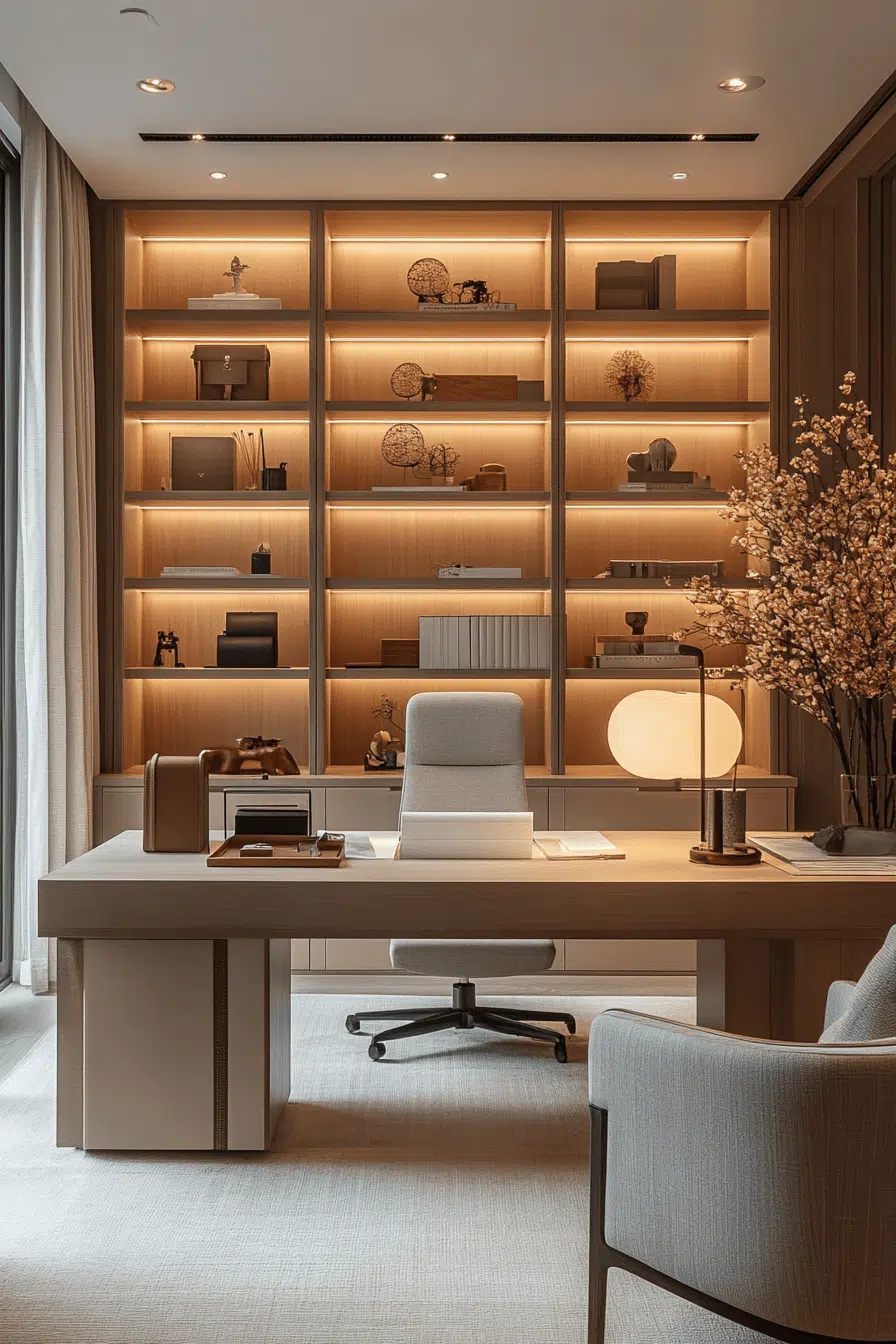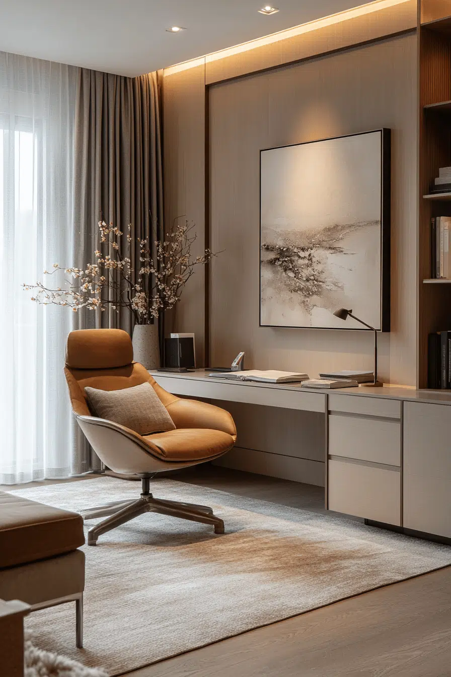 Simplicity becomes elevated through premium finishes and clean geometry. Balanced styling prevents excess while maintaining warmth. This approach supports calming office decor by prioritizing clarity. Cohesive tones create visual unity. The room feels refined and peaceful. Discover how luxury can feel calm and effortless.