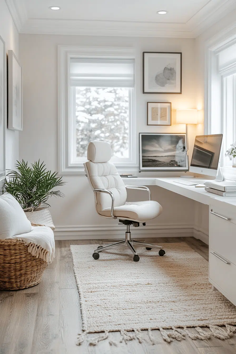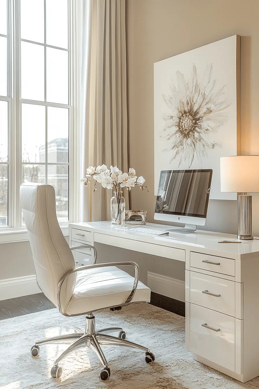 This workspace embraces softness from the very first glance. Gentle color transitions, streamlined furnishings, and open surfaces create a visual exhale for your mind. It enhances calming office decor by keeping stimulation low and clarity high. A warm desk lamp and supportive seating complete the atmosphere without adding clutter. The entire room feels light, intentional, and easy to settle into. Step into a workspace that instantly clears your head today.