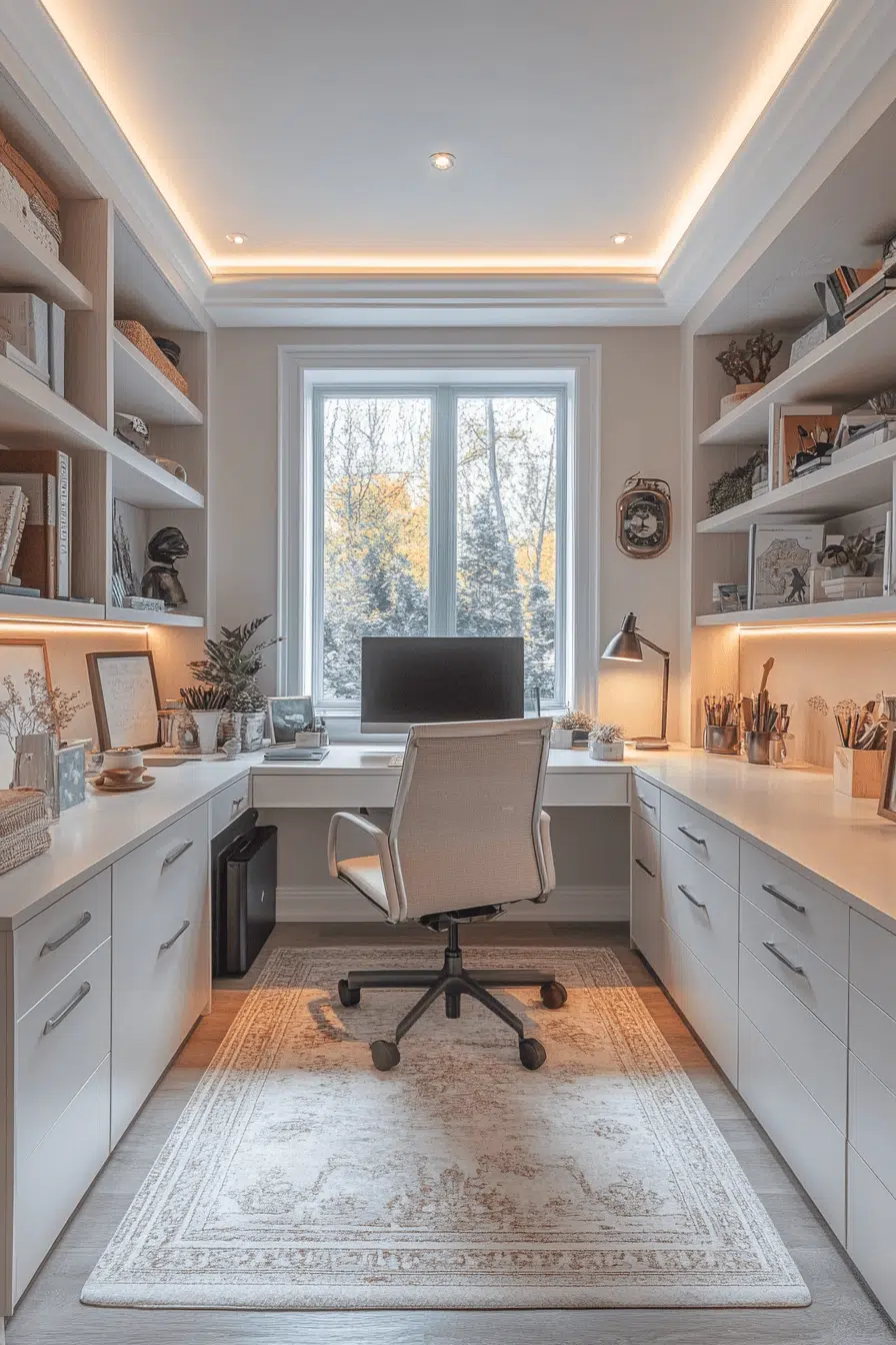 Everything within reach, nothing out of place defines this layout. Streamlined systems make daily tasks feel effortless. This configuration elevates calming office decor by reducing overwhelm through order. Neutral tones keep the room visually quiet. The space feels capable yet serene. Build a workspace that works smarter for you now.