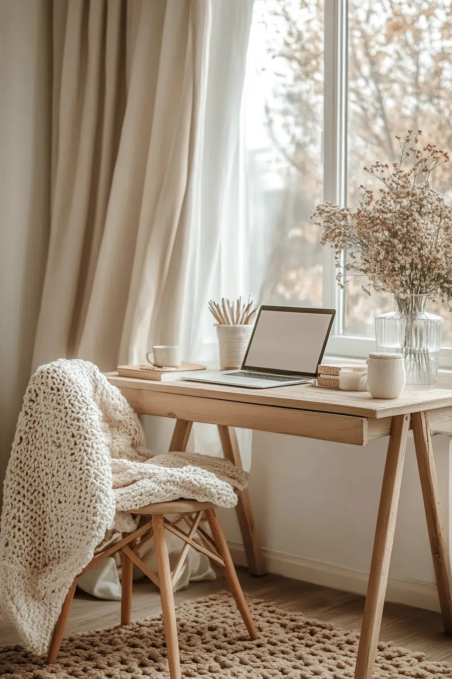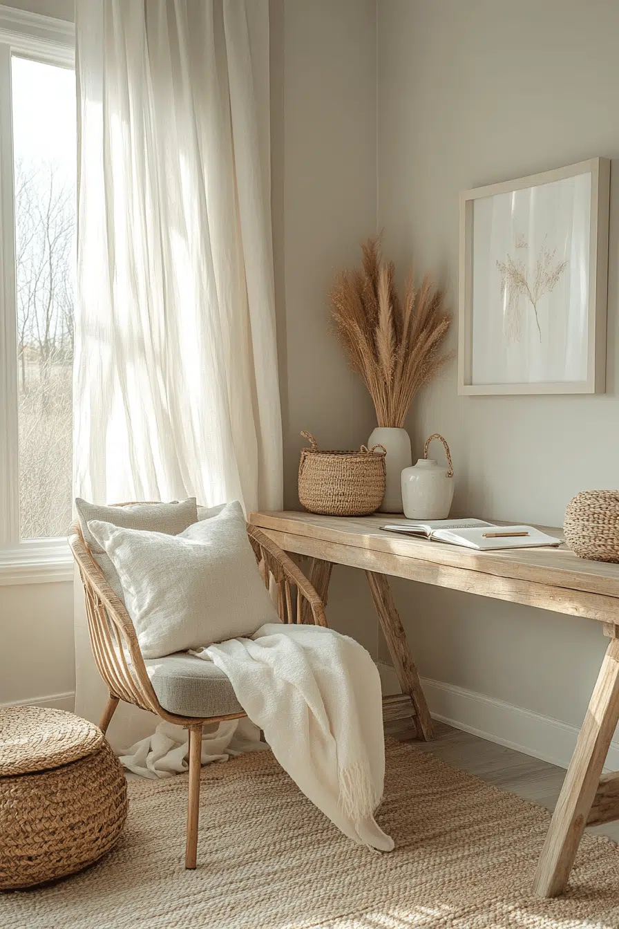 Golden beige undertones and creamy layers turn this nook into a stress-free zone. Warm neutrals create emotional comfort while still looking professional and refined. This aesthetic strengthens calming office decor by blending coziness with structure. Add natural fibers and subtle wood details for depth. The environment feels grounded, inviting, and steady. Refresh your office with warmth that works as hard as you do.