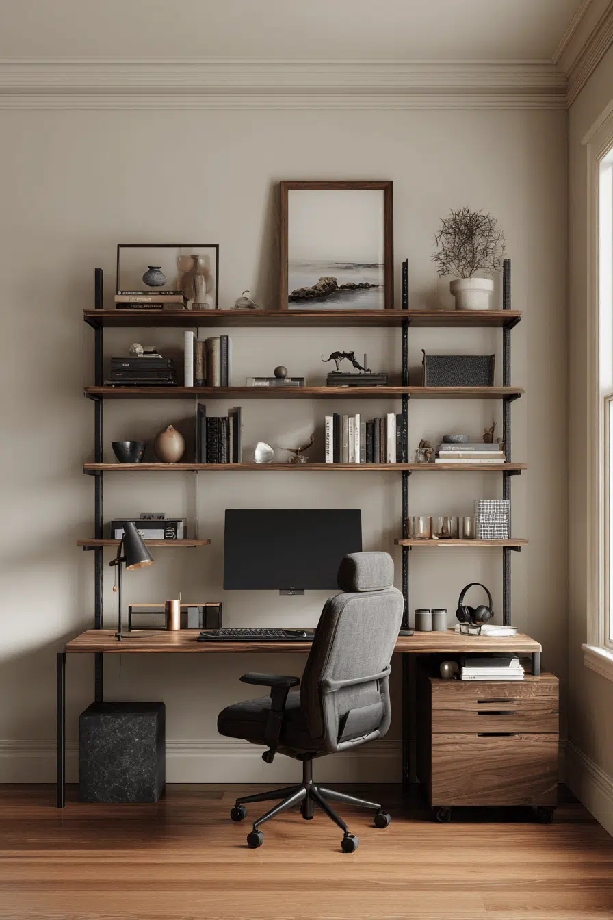 This layout proves that efficiency can feel peaceful. Open shelving, thoughtful spacing, and coordinated tones bring visual harmony to your workflow. It embodies calming office decor by pairing organization with tranquility. A few carefully chosen accents inspire without overwhelming. The room feels balanced, productive, and quietly energizing. Design a space that supports calm success starting now.