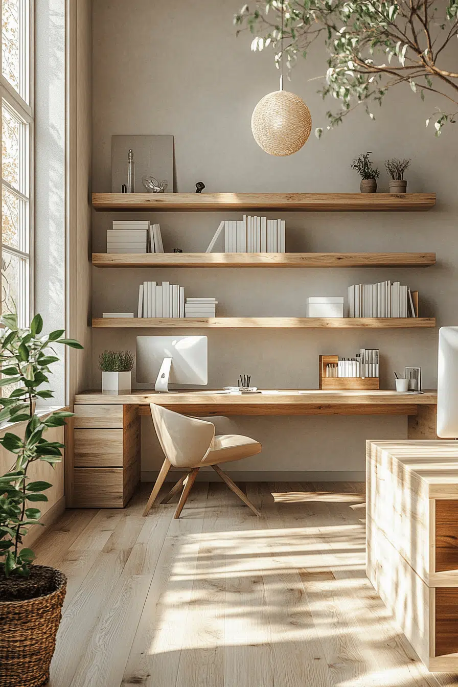 Pale timber surfaces and bright finishes make this room feel effortlessly open. Light woods add warmth without visual weight. This look supports calming office decor by encouraging focus through brightness and softness. Keep décor minimal and intentional. The space feels expansive, fresh, and motivating. Brighten your office with airy wood accents today.