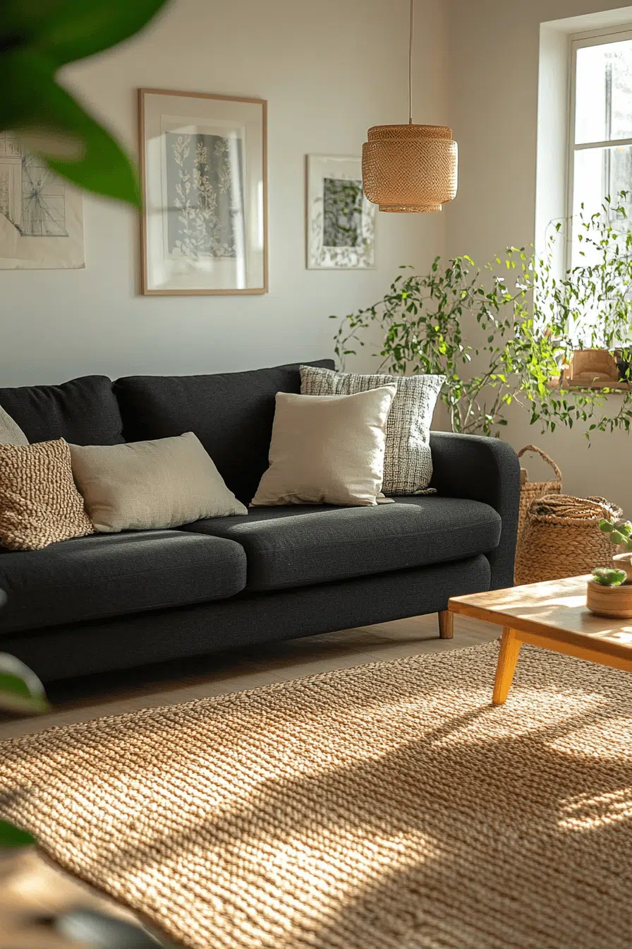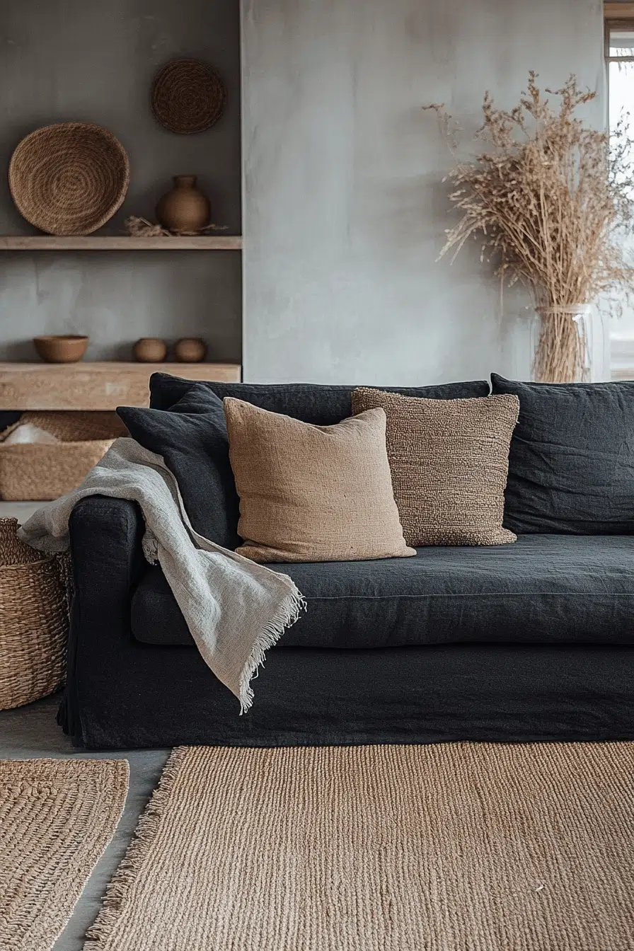 Earthy textures bring balance to a charcoal couch living room with organic appeal. Jute rugs, clay accents, and wood furnishings ground the deep gray sofa. Natural tones add comfort while maintaining bold contrast. Indoor spaces feel connected to nature effortlessly. Organic style meets modern edge. Click for more earthy ideas!