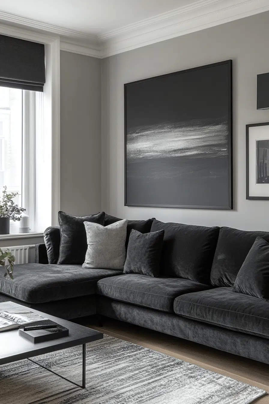 Charcoal couch living room styling creates a sleek, minimalist base ideal for modern, clean-lined decor. Deep gray upholstery works as a refined neutral, making room for bold accents or soft, calming tones. White walls and natural wood finishes introduce contrast without visual overload. Streamlined decor keeps the look sophisticated and intentional. Modern calm shines through with just a hint of edge. Tap for fresh inspiration!