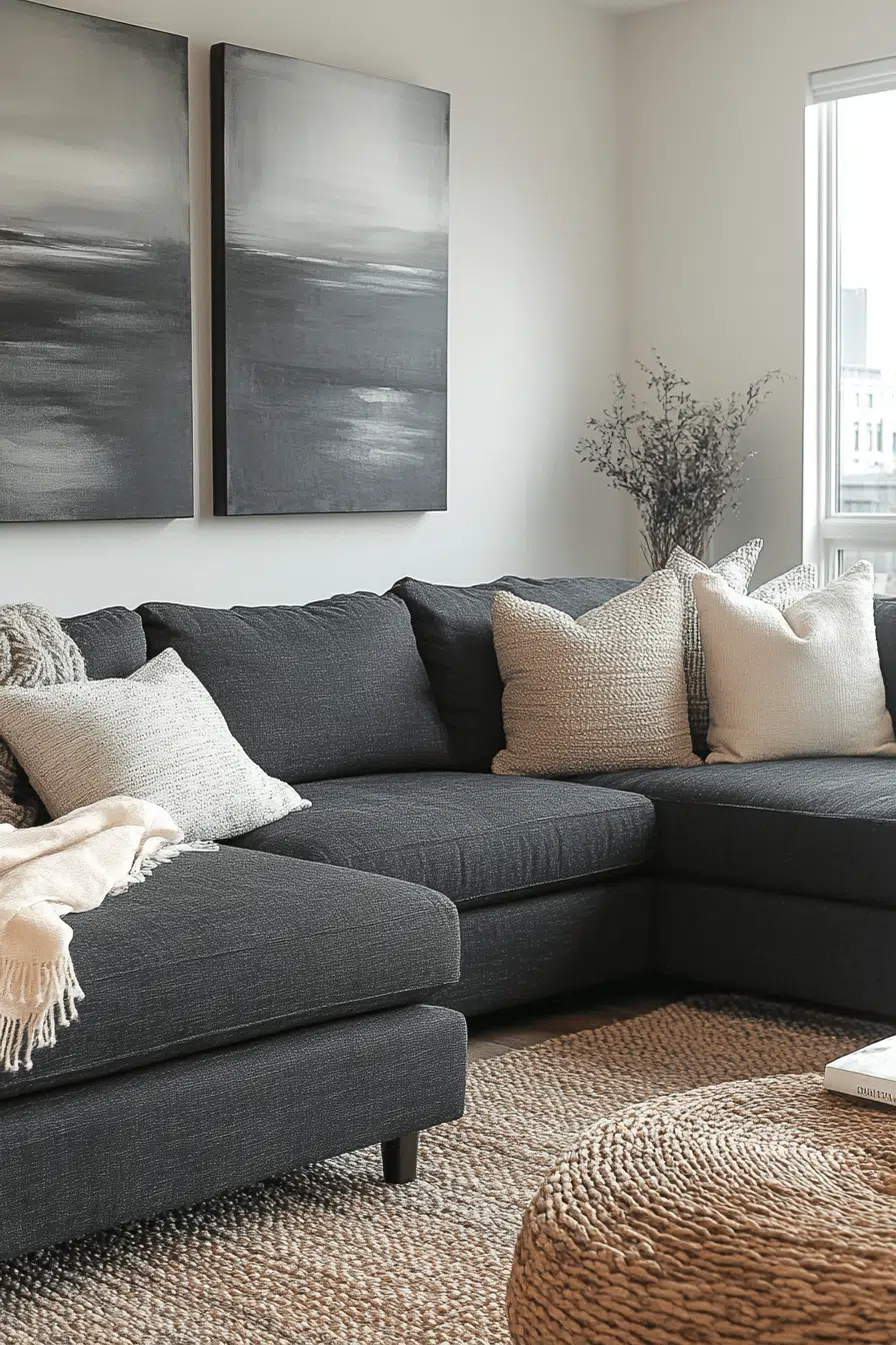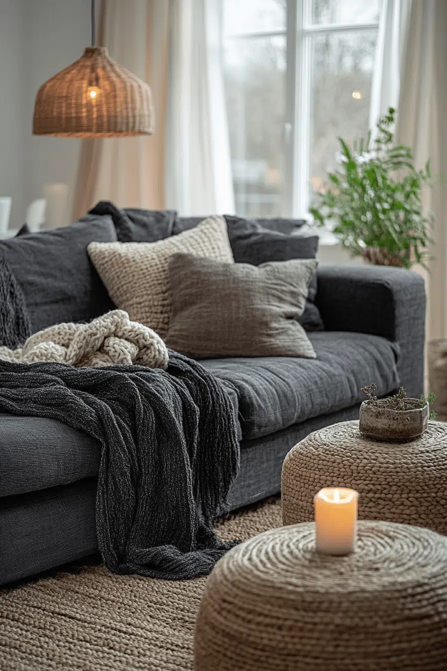 Layered textures instantly enrich a charcoal couch living room with warmth. Linen curtains, faux fur throws, and woven ottomans soften the dark sofa beautifully. Charcoal grounding allows textures to shine. Cozy comfort feels intentional and welcoming. Dark furniture becomes approachable and stylish. Tap for layering tricks!