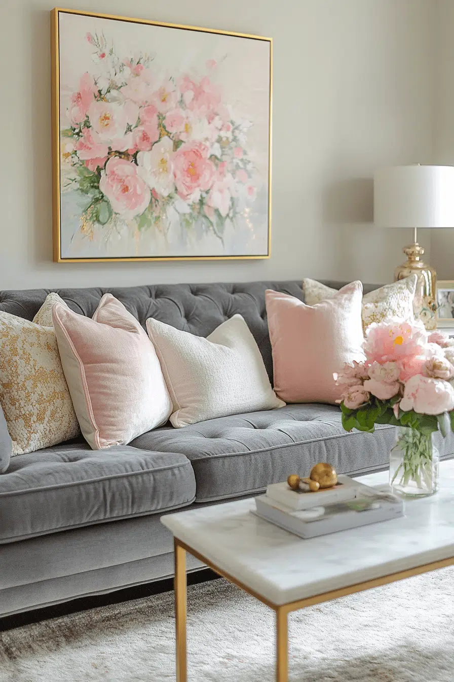 Soft-toned accents brighten a charcoal couch living room with gentle contrast. Blush, ivory, and muted hues lighten the bold sofa beautifully. Brushed gold finishes and subtle patterns add charm. Romantic warmth blends effortlessly with modern style. Smaller spaces especially benefit from this approach. Click to see soft-toned combos!