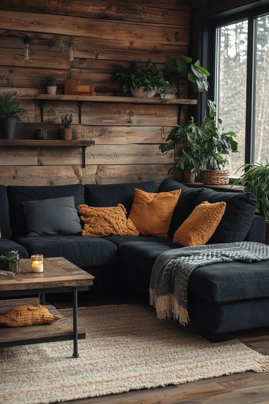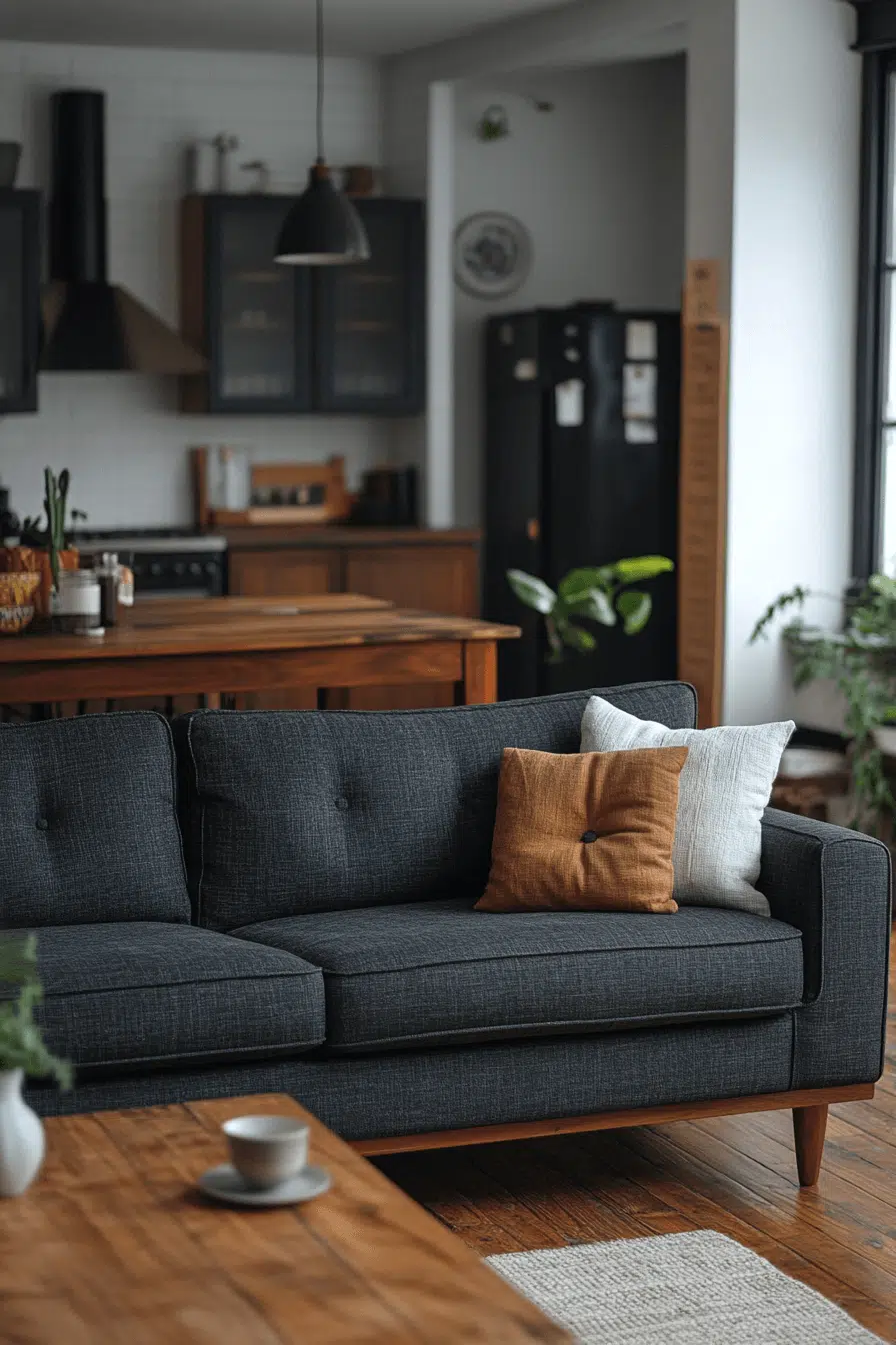 Rustic touches introduce warmth and personality to a charcoal couch living room. Reclaimed wood tables, wool throws, and farmhouse lighting add charm. Dark upholstery keeps the look modern and grounded. Old and new elements blend comfortably. Cozy appeal meets updated style effortlessly. Click to discover rustic-modern fusion!