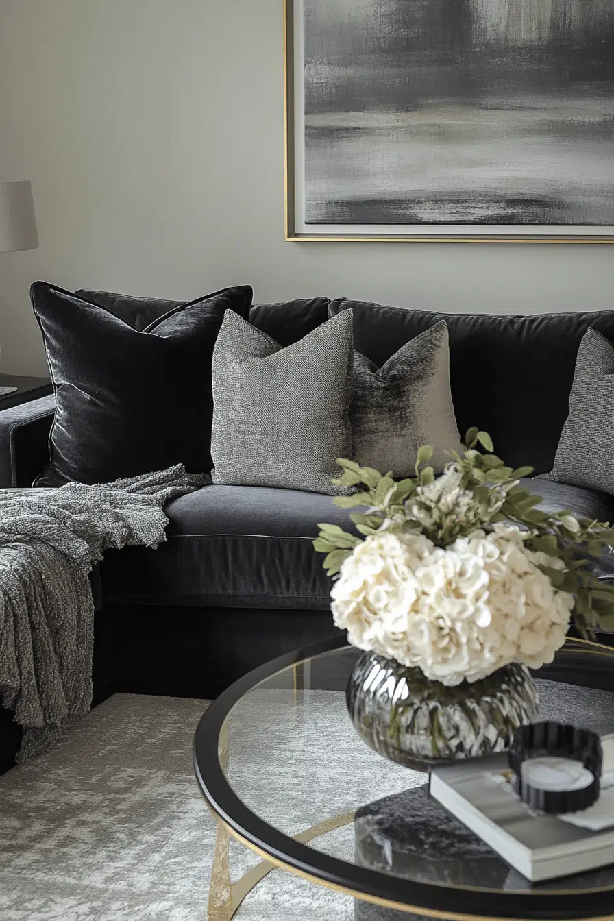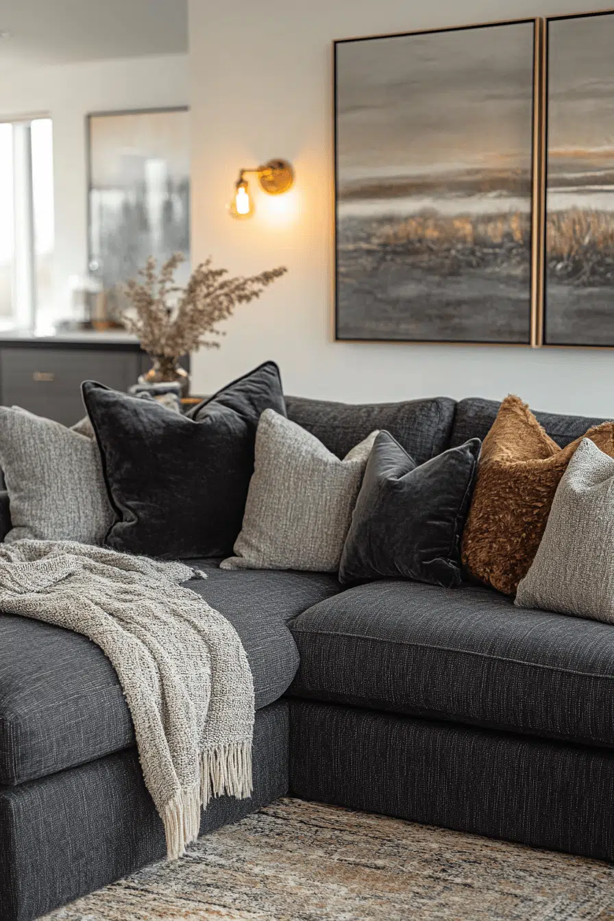 Luxe textures elevate a charcoal couch living room with added depth and elegance. Velvet, boucle, and soft chenille instantly make the dark sofa feel upscale and inviting. Gold or glass accents introduce subtle glamour. Designer polish meets everyday comfort seamlessly. Timeless grounding keeps the space cohesive. Click now for decor tips!