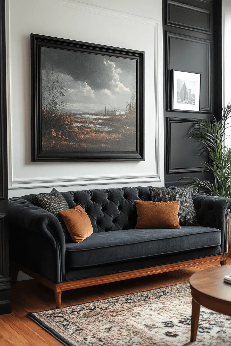 Classic-meets-modern styling elevates a charcoal couch living room with refined contrast. Crown molding and paneled walls highlight the clean lines of the dark sofa. Depth and balance emerge naturally. Metallic accents or antique mirrors add elegance. Polished style remains approachable and timeless. Click to browse classic-modern mixes!