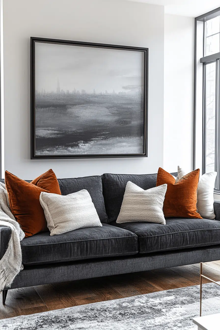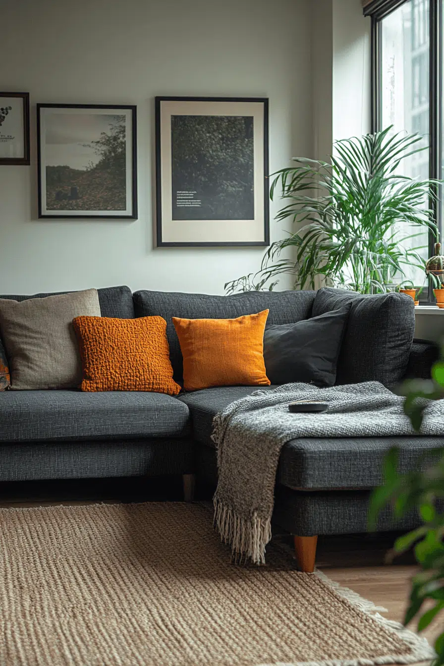 Bright, airy accents give a charcoal couch living room striking visual contrast. Light walls open up the space while the dark sofa anchors everything with sophistication. Greenery and pale wood details soften the balance beautifully. Fresh energy meets modern calm in this adaptable design. Seasonal updates feel effortless here. Click here to see more!