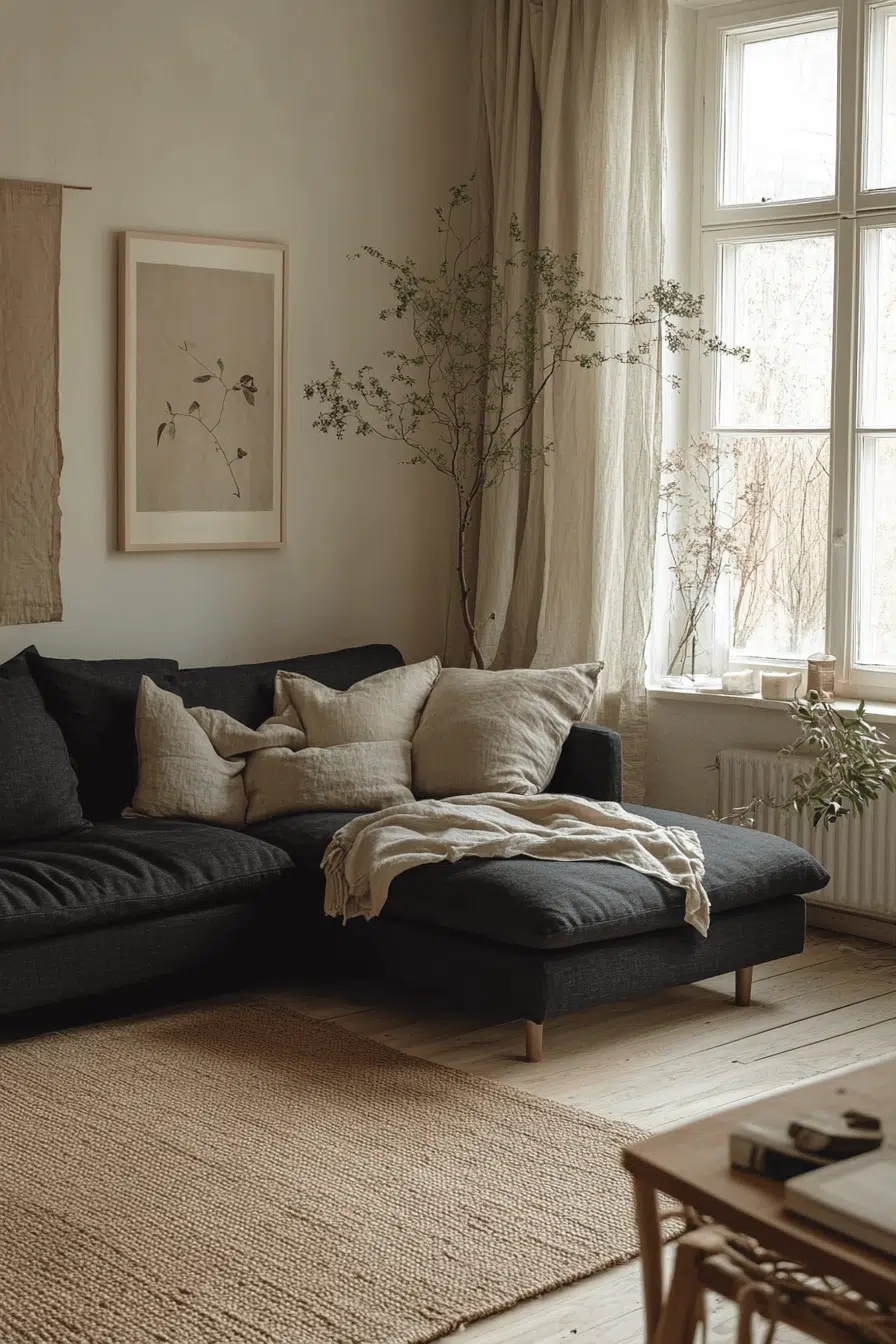 Scandinavian simplicity softens a charcoal couch living room with light neutrals and natural materials. Pale oak floors, airy curtains, and understated decor balance the dark seating. Charcoal becomes a visual anchor in an otherwise bright space. Greenery and minimalist art add interest without clutter. Effortless style meets serene comfort. Tap to get inspired!