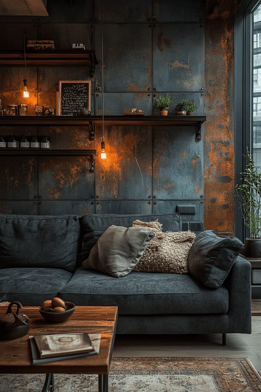 Urban loft character defines a charcoal couch living room built around industrial textures. Exposed brick, black metal, and concrete finishes complement the moody gray tones perfectly. Raw elements feel refined when paired with the plush sofa. Large artwork and accent lighting complete the city-inspired vibe. Modern living feels bold yet comfortable. Tap to dive into the aesthetic!