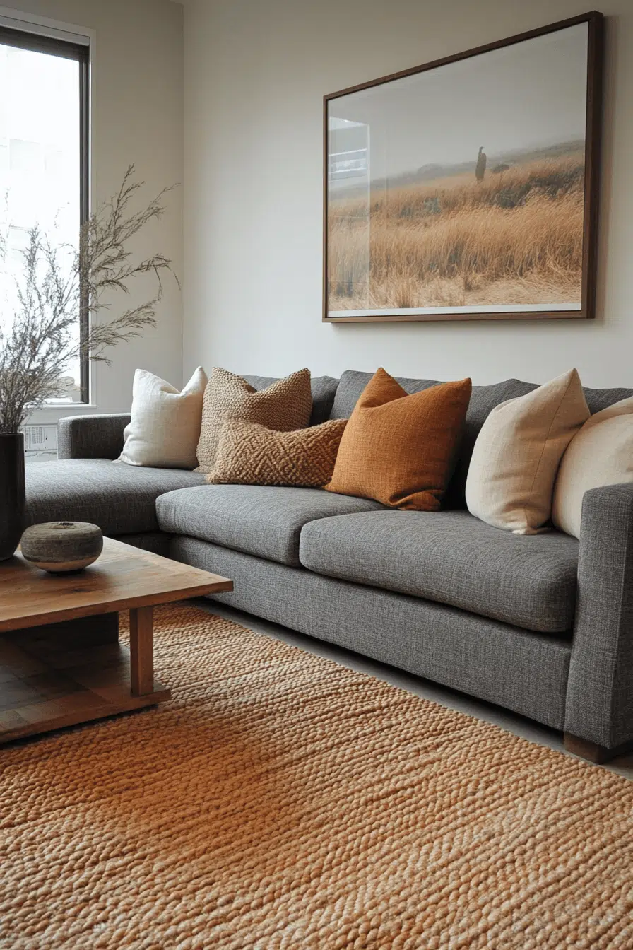 Warm neutral tones transform a charcoal couch living room into a cozy retreat. Beige walls, sand-toned rugs, and caramel woods soften the intensity of the dark sofa. Richness and warmth blend harmoniously. Calm energy fills the space without sacrificing style. Everyday living feels inviting and modern. Tap for cozy styling ideas!