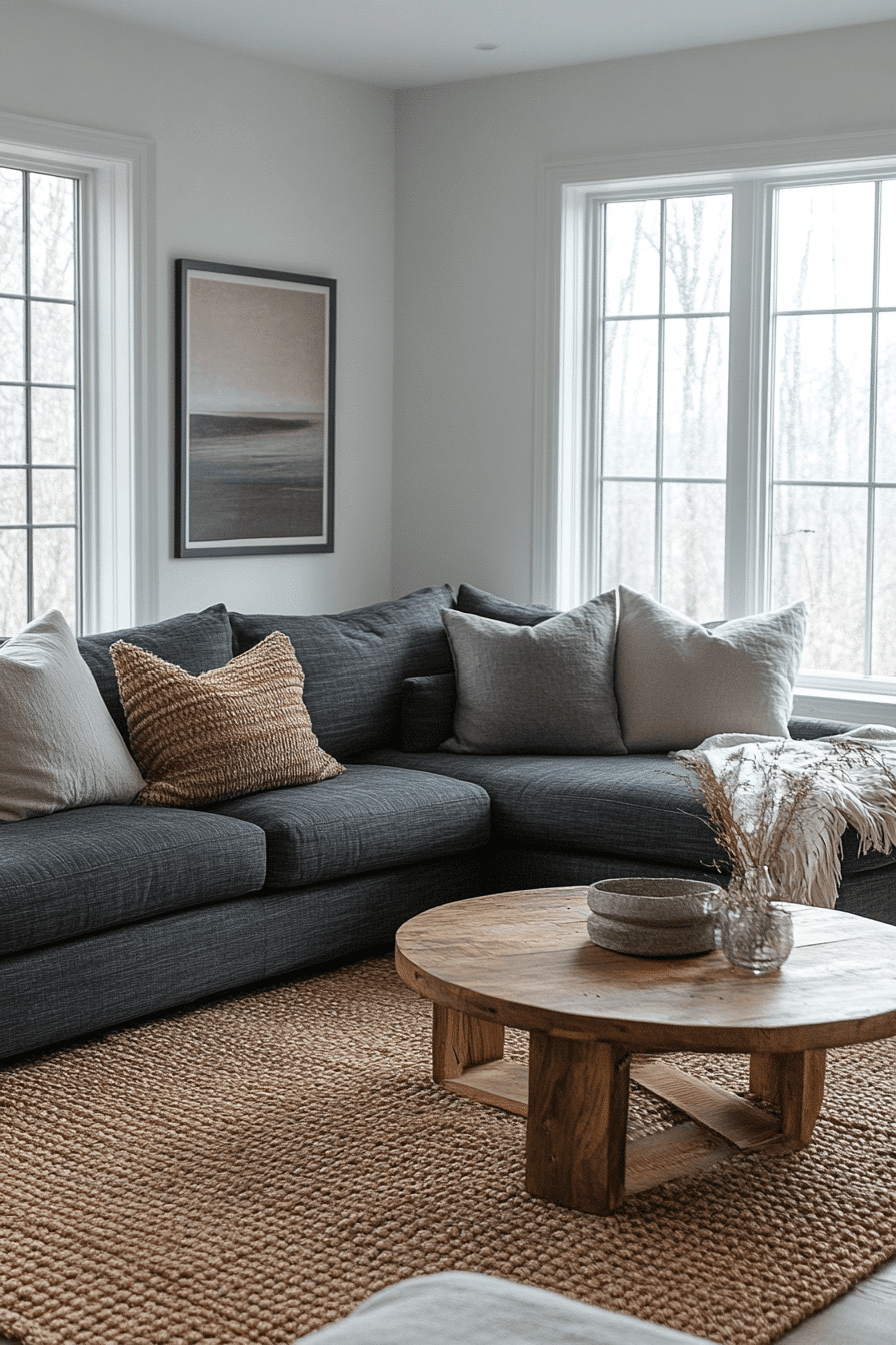 Rustic touches introduce warmth and personality to a charcoal couch living room. Reclaimed wood tables, wool throws, and farmhouse lighting add charm. Dark upholstery keeps the look modern and grounded. Old and new elements blend comfortably. Cozy appeal meets updated style effortlessly. Click to discover rustic-modern fusion!