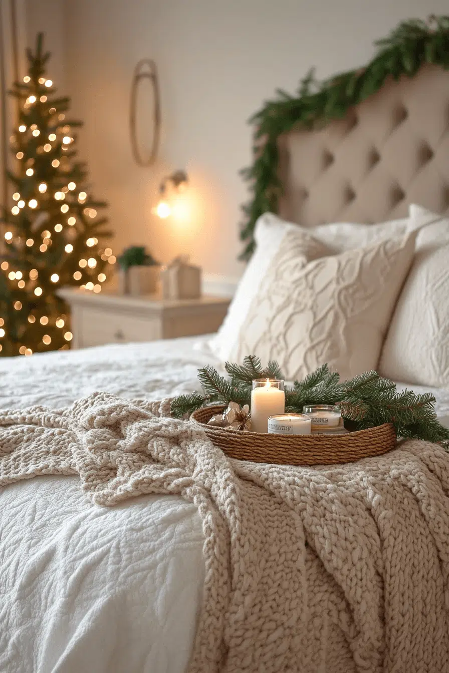 Warm-neutral christmas bedroom decor makes your space feel grounded, cozy, and welcoming. Soft browns, golden undertones, and creamy whites build a peaceful palette. Layering warm textiles adds an inviting seasonal touch. This look is soothing and beautifully balanced.