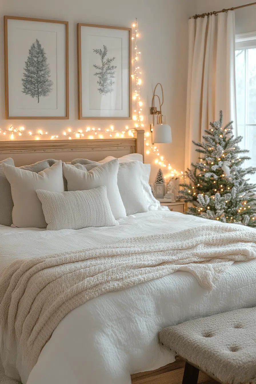 Soft twinkle lights make christmas bedroom decor feel instantly cozy and magical. Wrap them around headboards, windows, or ceilings for a dreamy glow. Add garlands or subtle ornaments to complement the illumination. The gentle sparkle brings warmth and serenity to your nights.
