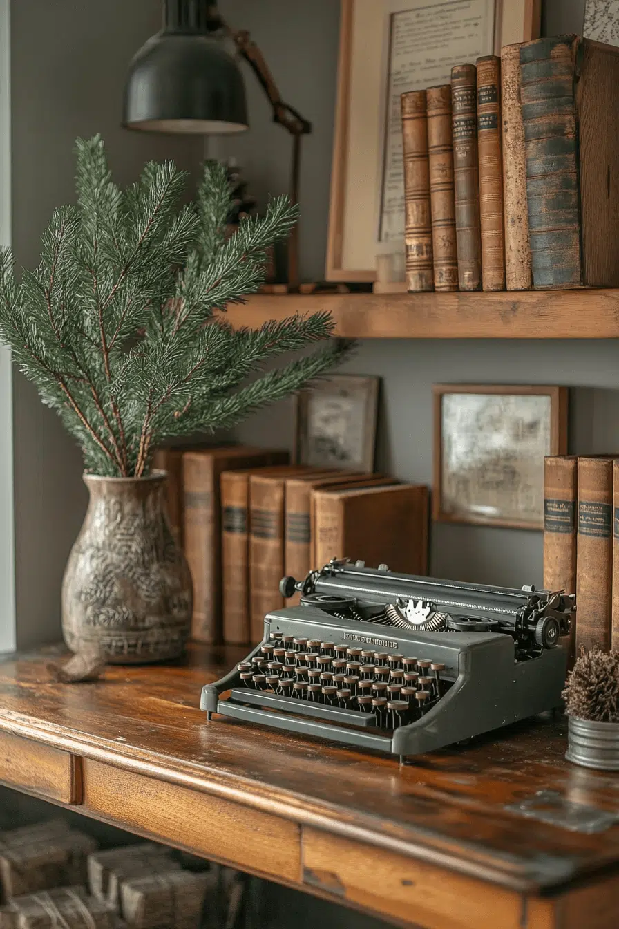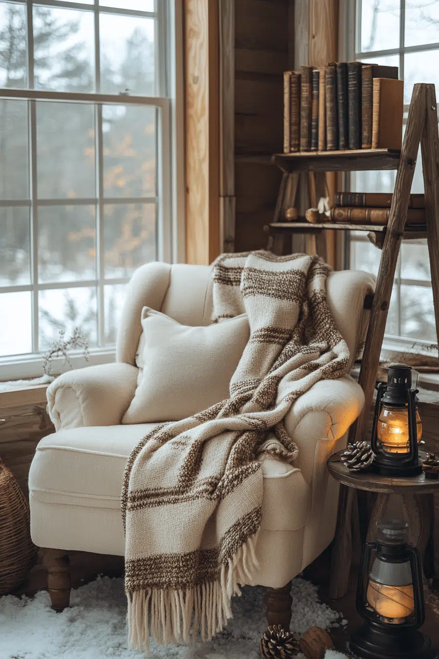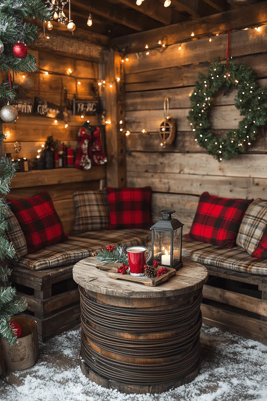 Create magic inside your reading corner by styling it with christmas decorations rustic full of peaceful personality. Wool blankets and soft chairs build irresistible comfort. Burlap-wrapped books enhance natural holiday character. Wood star accents complete cozy visual balance. This snug nook inspires heartfelt moments with stories and winter warmth.