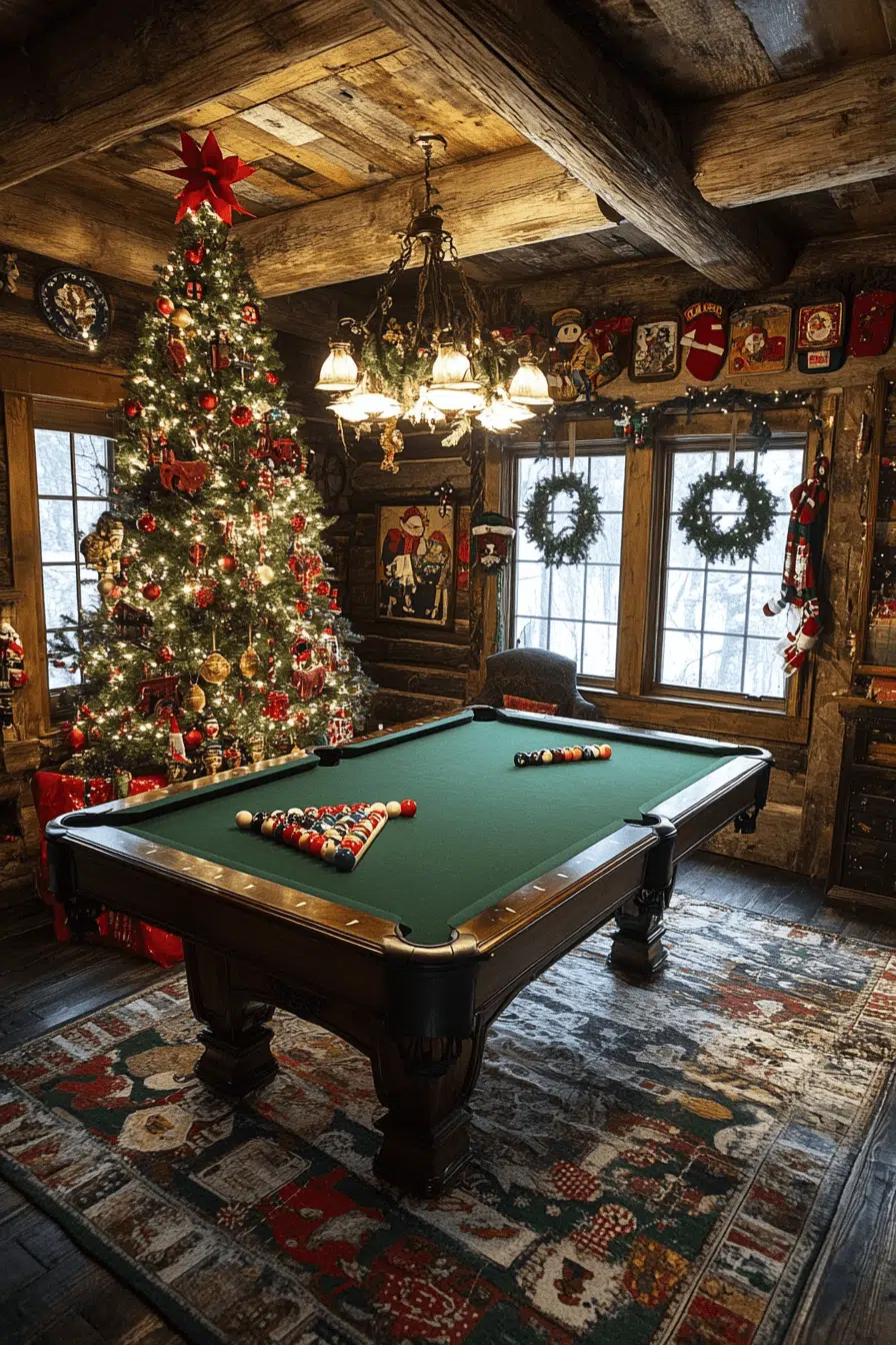 Boost lively personality inside your game room through christmas decorations rustic shaped for fun and cozy gatherings. Buffalo check prints bring vibrant seasonal texture. Wooden wall games strengthen playful holiday character. Vintage crates filled with blankets enhance comfort during family time. Rustic trees tie everything together with spirited charm.