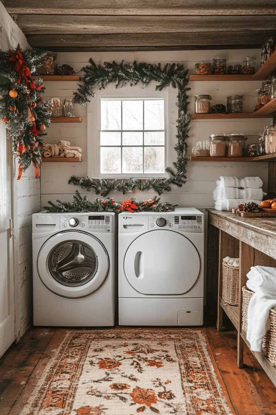 Refresh your laundry room with warm seasonal spirit using christmas decorations rustic that soothe senses throughout the space. Orange garlands and cinnamon bundles bring nostalgic fragrance. Wood signage lifts rustic style with homey appeal. Linen textures reinforce comforting simplicity. This cozy laundry corner energizes pleasant productivity during winter days.