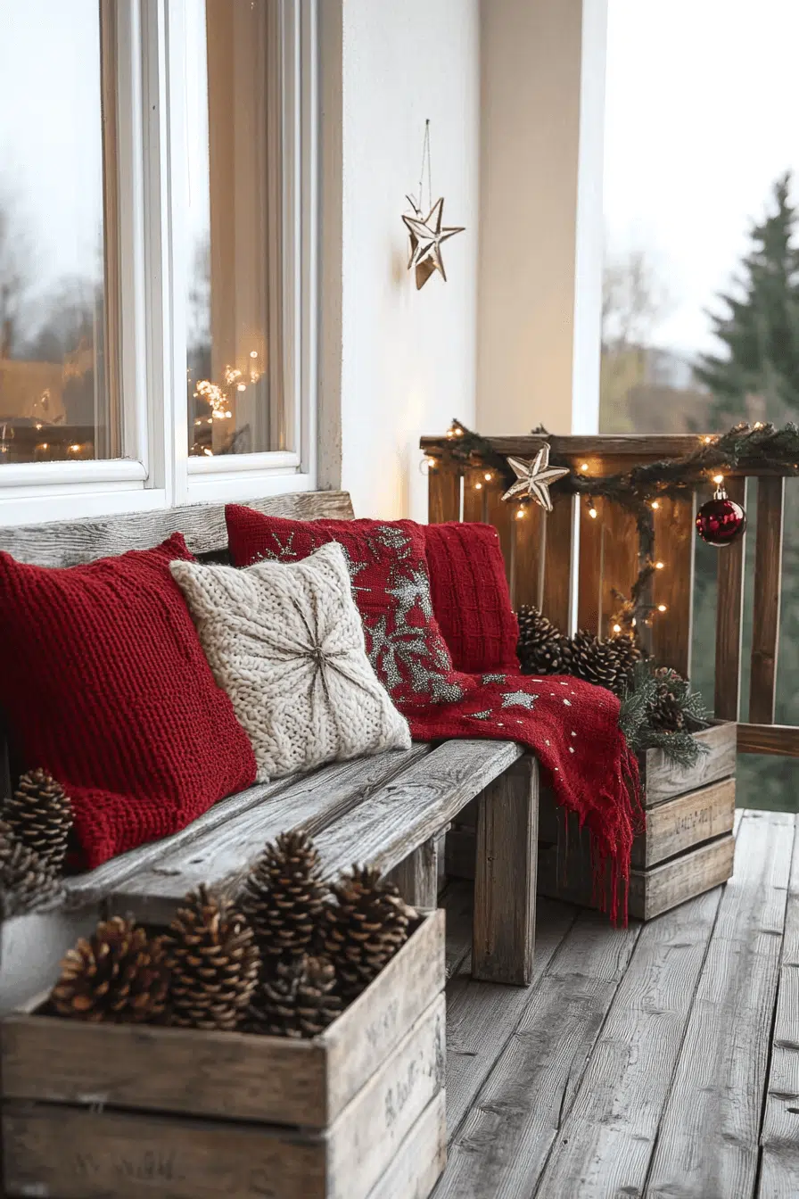 Embrace outdoor charm by turning your balcony into woodland warmth through christmas decorations rustic with natural texture. Pinecones, crates, and lanterns work together for cozy balance. Patterned outdoor rugs deepen festive comfort. Candlelit lanterns glow gently against chilly evenings. This rustic balcony encourages joyful seasonal unwinding.