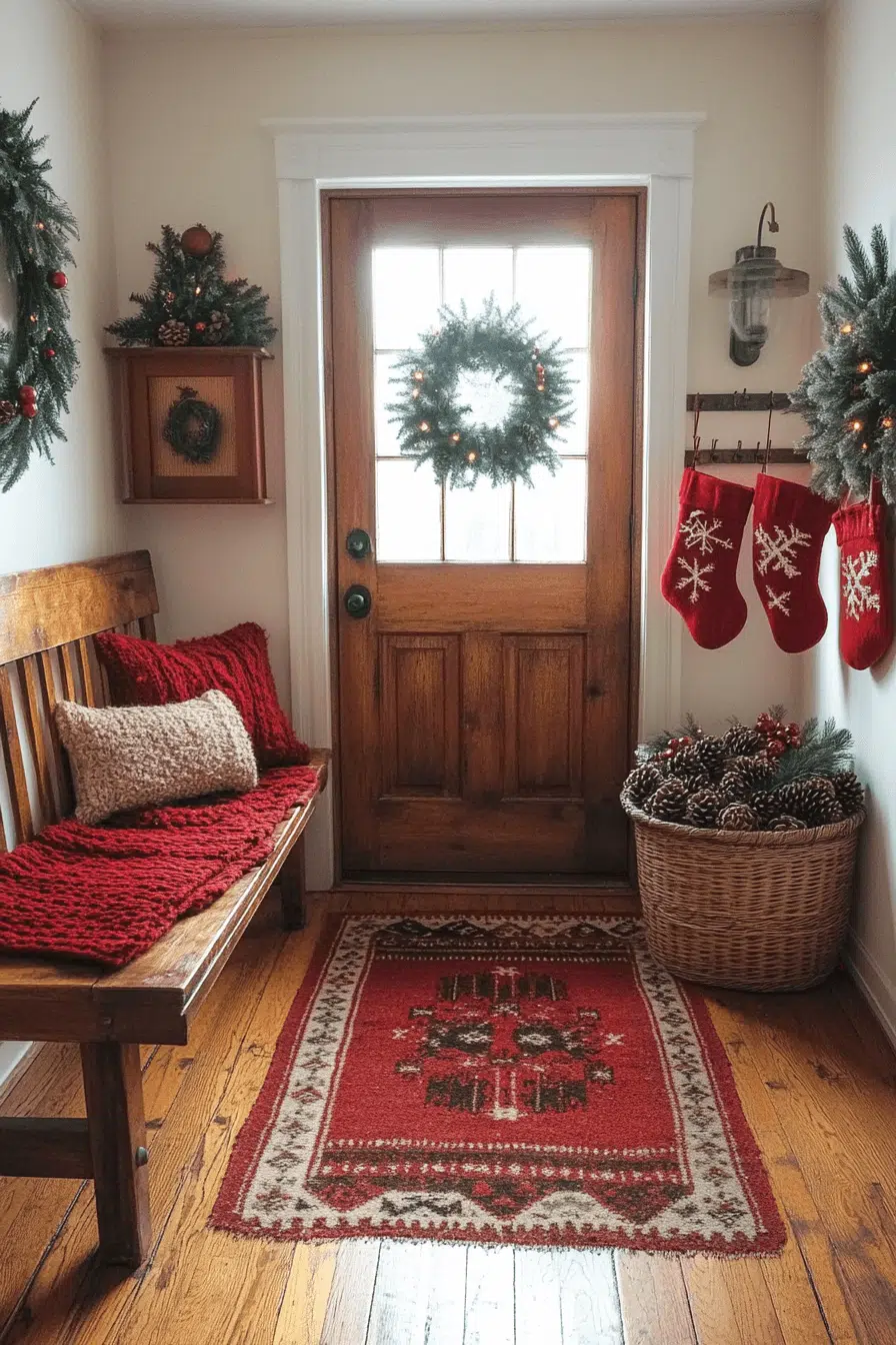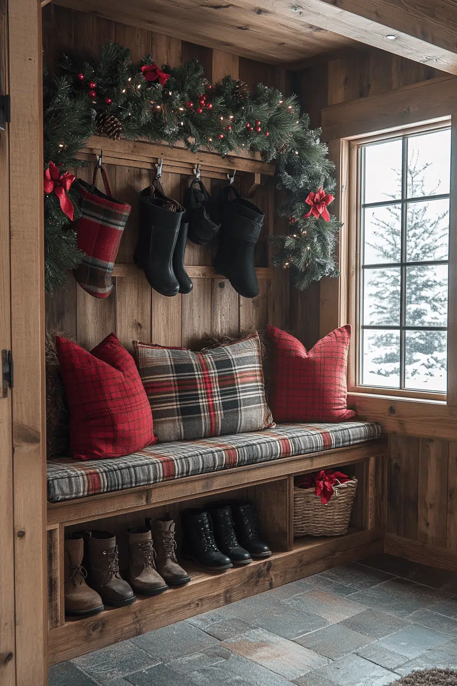 Invite heartwarming charm into your mudroom by incorporating christmas decorations rustic that welcome guests instantly. Plaid cushions brighten practical seating areas. Wooden crates double as decor and organization. Scarves and greens hung on hooks add festive excitement. This functional entry inspires joyful arrivals all season long.