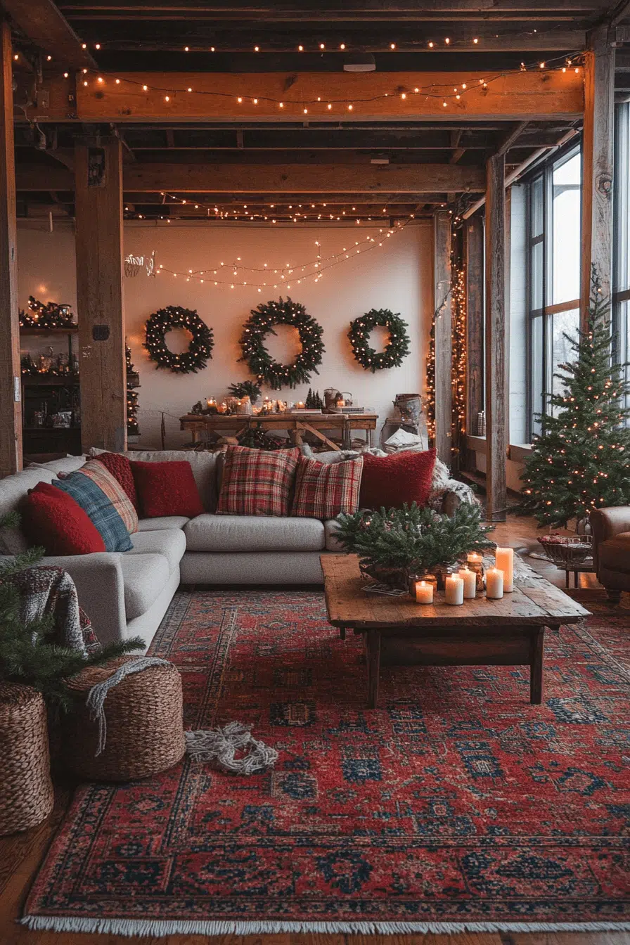 Enhance your loft with comforting nature-driven beauty by decorating with christmas decorations rustic blended with industrial elements. Dried herb garlands complement exposed beams with warm contrast. Rustic candle displays elevate metal surfaces with soft seasonal glow. Wooden advent pieces introduce vintage holiday excitement. Cozy seating fills this open space with inspiring winter comfort.