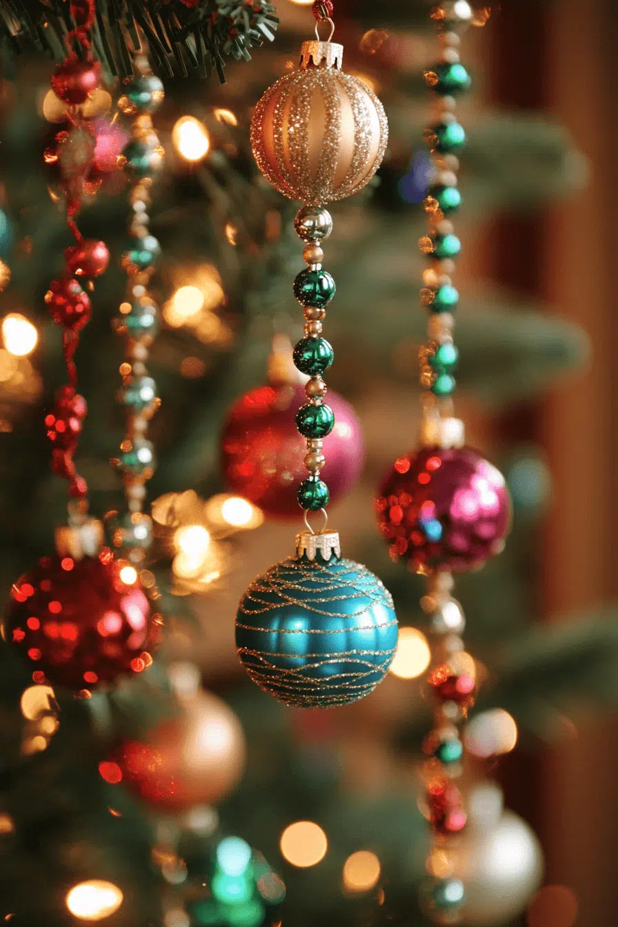 Beaded garland Christmas ornaments create flowing movement and sparkling texture with strands that drape gracefully across your decor. Their pearls, metallics, or colorful beads add depth and liveliness. These ornaments accent trees, mantels, and railings beautifully. Each drape catches the light, adding dimension to your space.
