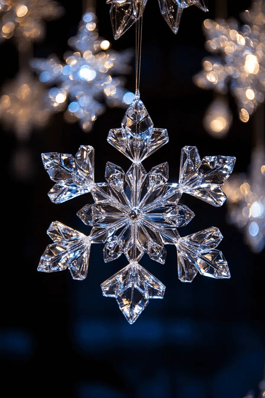 Crystal-like snowflake ornaments shimmer with icy brilliance that instantly transforms your tree into a sparkling winter scene. Each intricate shape dances with light as the tree moves. Their frosty aesthetic works beautifully with minimalist palettes or traditional holiday schemes. Even a small grouping brings a sense of magical snowfall indoors.