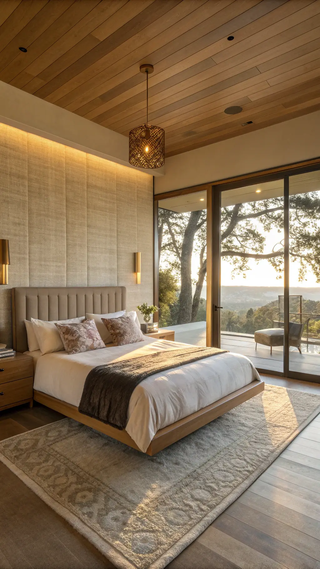 Primary suite bathed in golden morning light featuring camel leather bed, floating bleached oak nightstands with hidden lighting, layered window treatments in natural fibers, and handcrafted pottery collection.