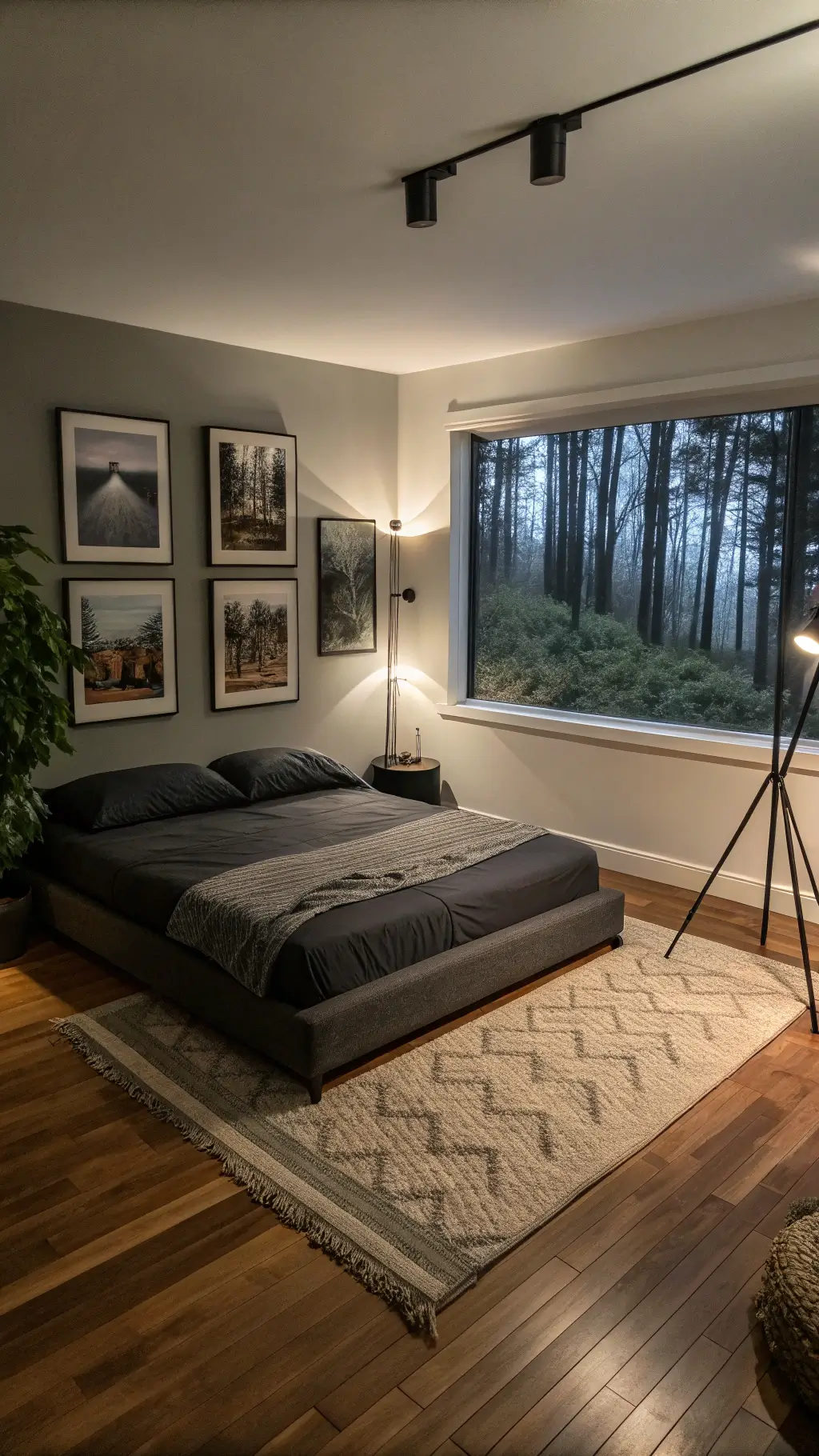 Cozy 10x12ft bedroom with diffused afternoon light reflecting off bleached maple platform bed with integrated nightstands, tonal layers of greige bedding complemented by hand-knotted throws, featuring a reading nook, vintage brass floor lamp and gallery wall with varied black and white photographs.