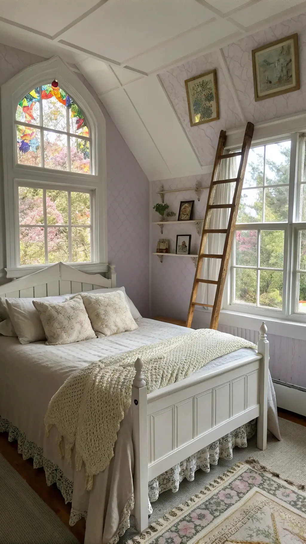 Vintage-style bedroom bathed in dawn light featuring cream wrought iron bed with layers of pastel linens, antique quilts on a weathered ladder, white pottery on floating shelves, filtered light through linen roman shades and potted ferns for added greenery.